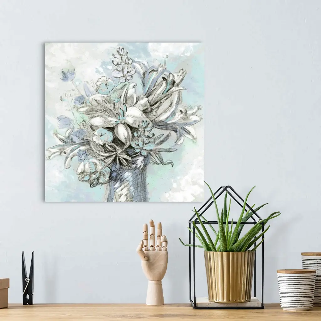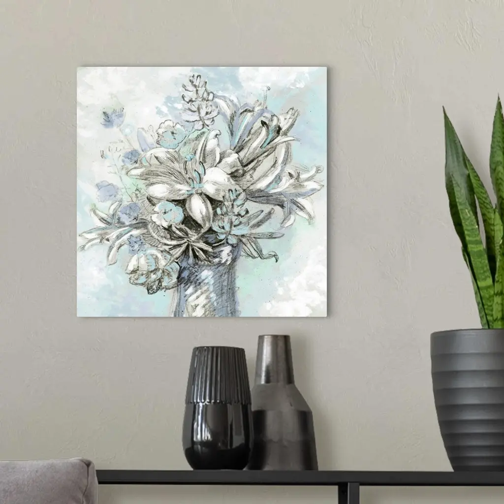 A modern sketch of a vase full of flowers in shades of turquoise and blue.