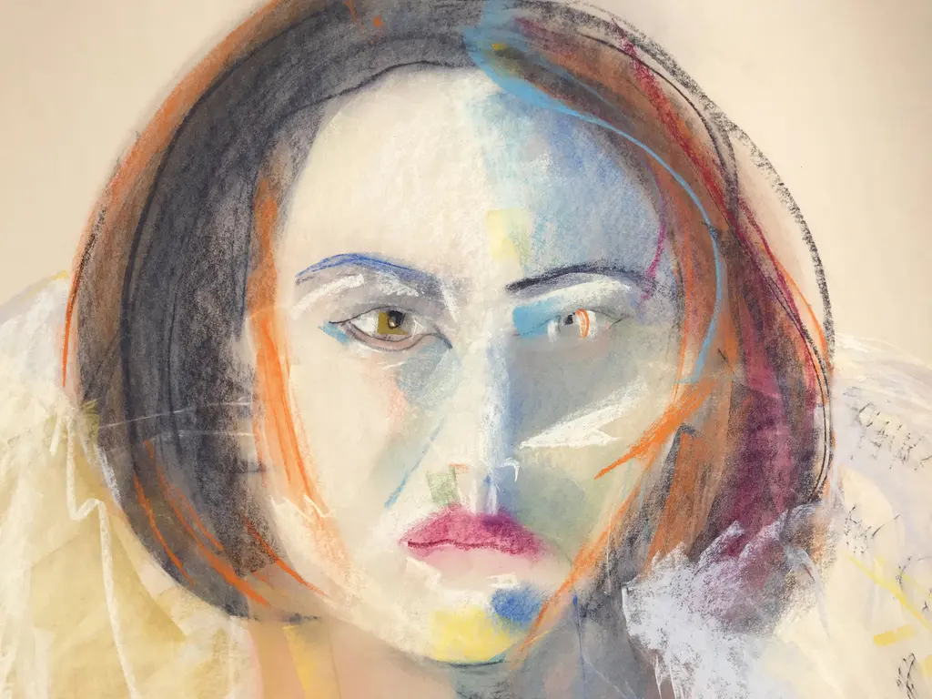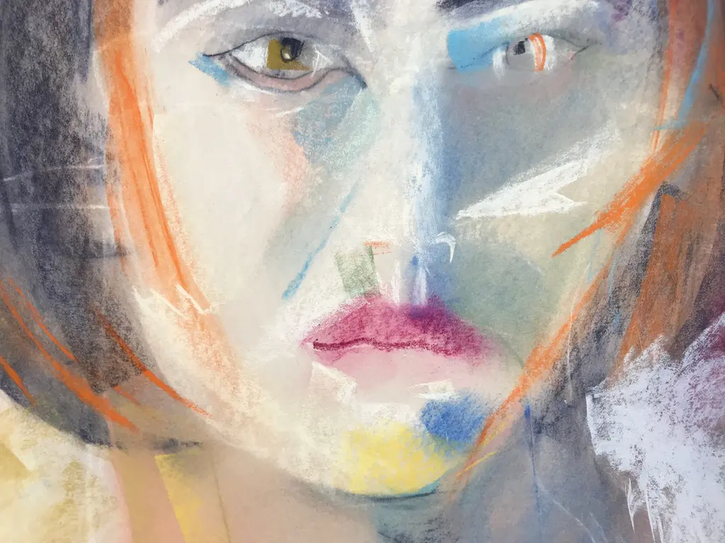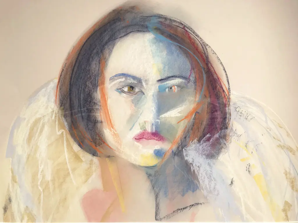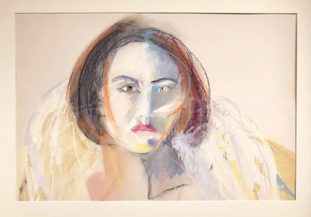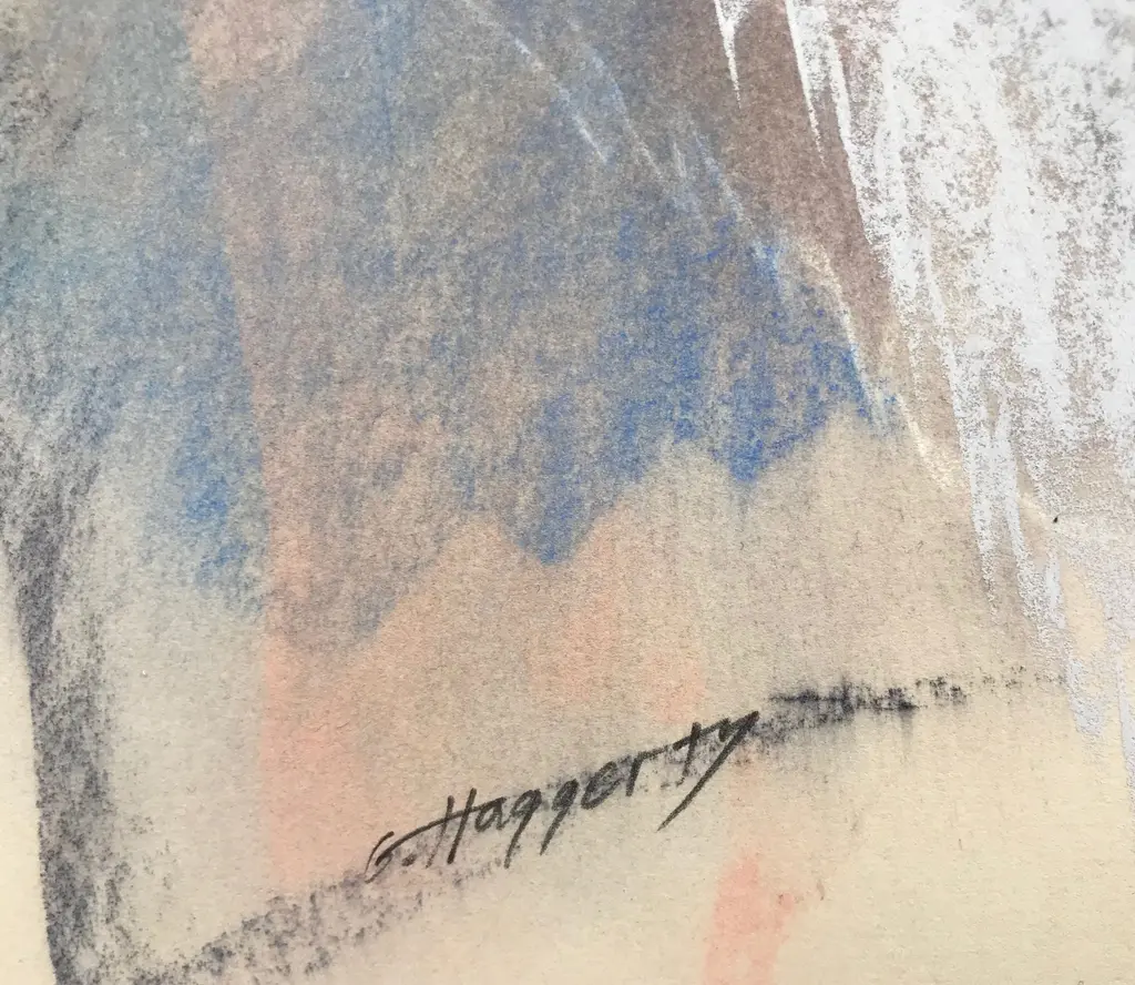 Expressionist pastel portrait of a glamorous woman in a feather boa. Presented matted in a giltwood frame. Signed lower center. View area: 29"L x 19"H. Haggerty taught at Brooklyn College, CUNY, UCSB, and Chautauqua Institution. He won fellowships from the National Endowment for the Arts, National Endowment for the Humanities, and Ford Foundation. His art is in the collections of Bowdoin College Museum, Chrysler Museum, Laguna Museum, and Portland Art Museum. Some smudges consistent with medium.