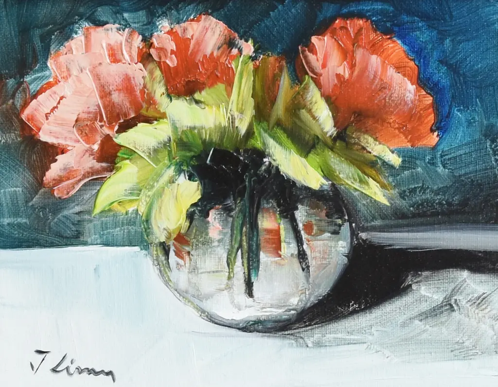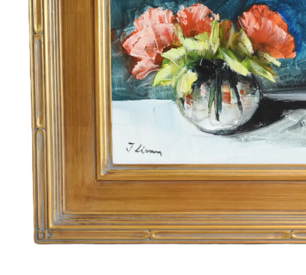 Impressionist abstract bouquet of pastel red roses flowers in a vase oil painting on stretched artist canvas. Signed by the talented artist ���J Lima” in the lower left corner. Also signed on the reverse. Included are the beautifully antiqued gold wood frame and hanging hardware/wire. Dimensions: Artwork, 10”L x 8’”H; overall, including the frame, 16.25������L x 14.25”H. Excellent beautiful condition!!!