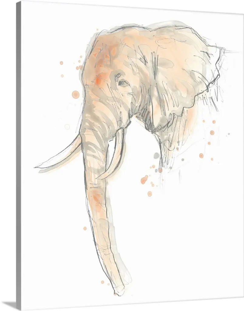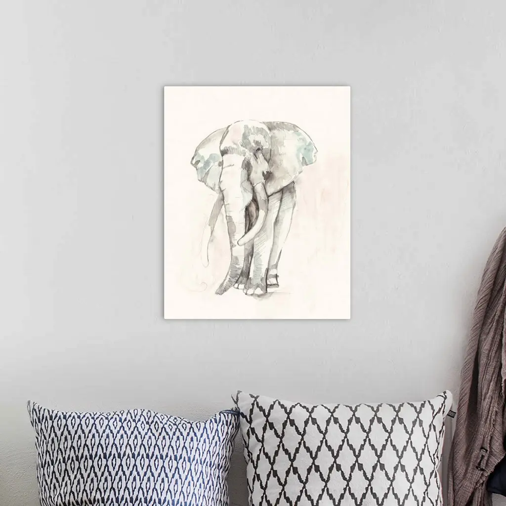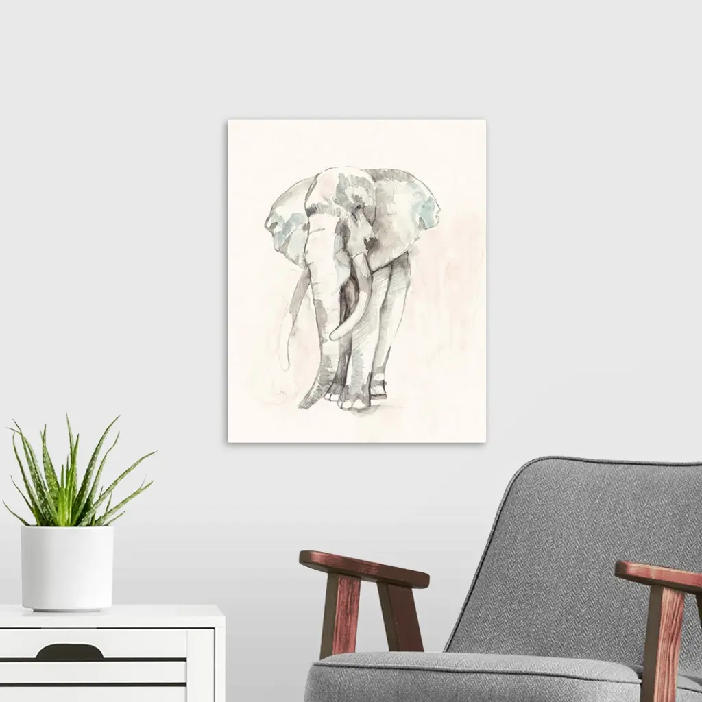 Contemporary abstract painting of an elephant in soft pastel hues.