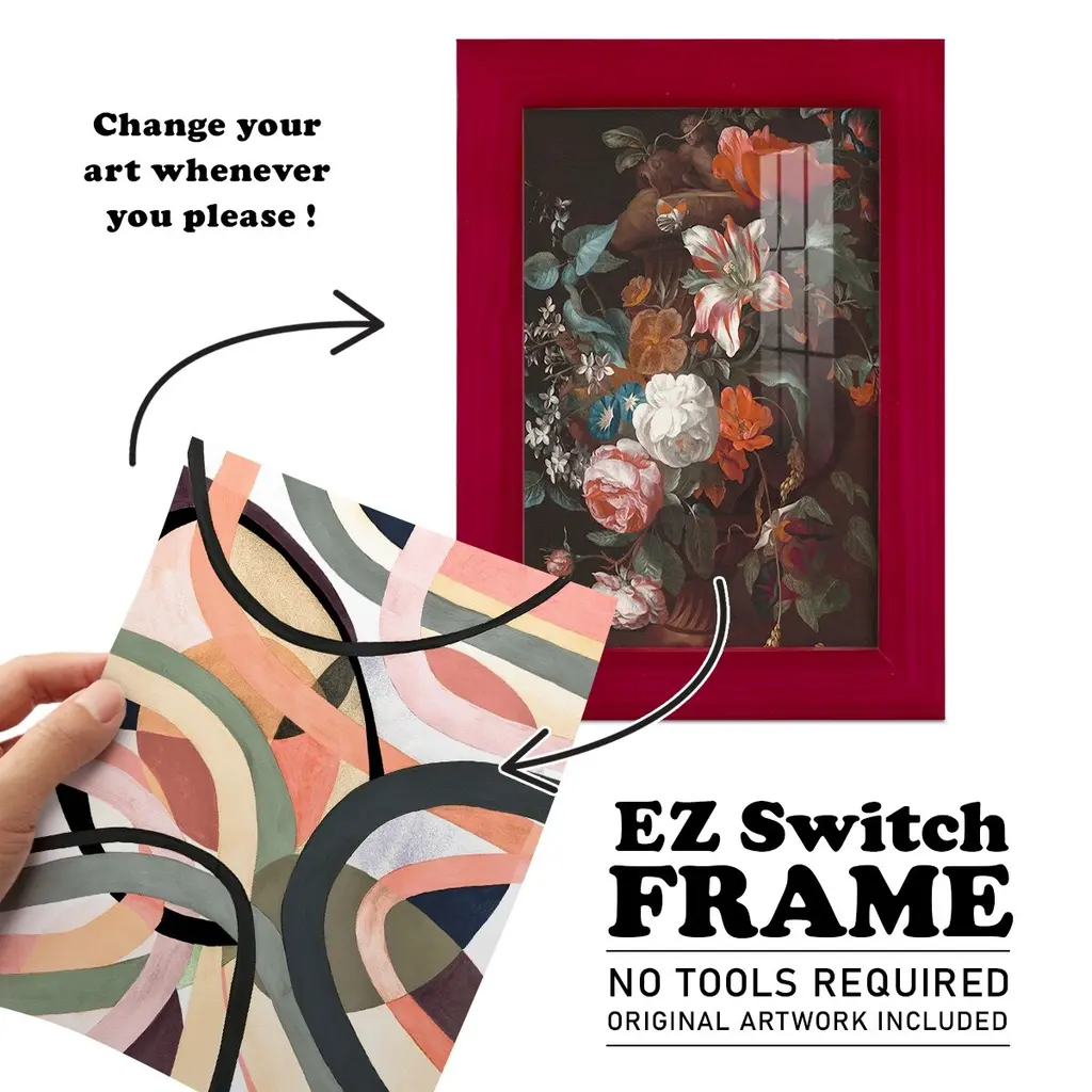 Pastel Tangle II -EZ SWITCH Framed Print w/glass-Cherry Red A delightful, framed print. Featuring a solid wood frame with real wood glass. This premium print is giclee quality. In addition, every frame features a removable back and table top stand. This allows you to change your art in the future or to just stand the art on a table for a new look. We are sure you'll enjoy our new series of EZ SWITCH Framed Art. Solid Wood Frame Real Glass Removable / Replaceable Art Built in Tabletop Stand Sizes range from 4x6 up to 12x15 - buy just one or pair them up as sets as you see fit.