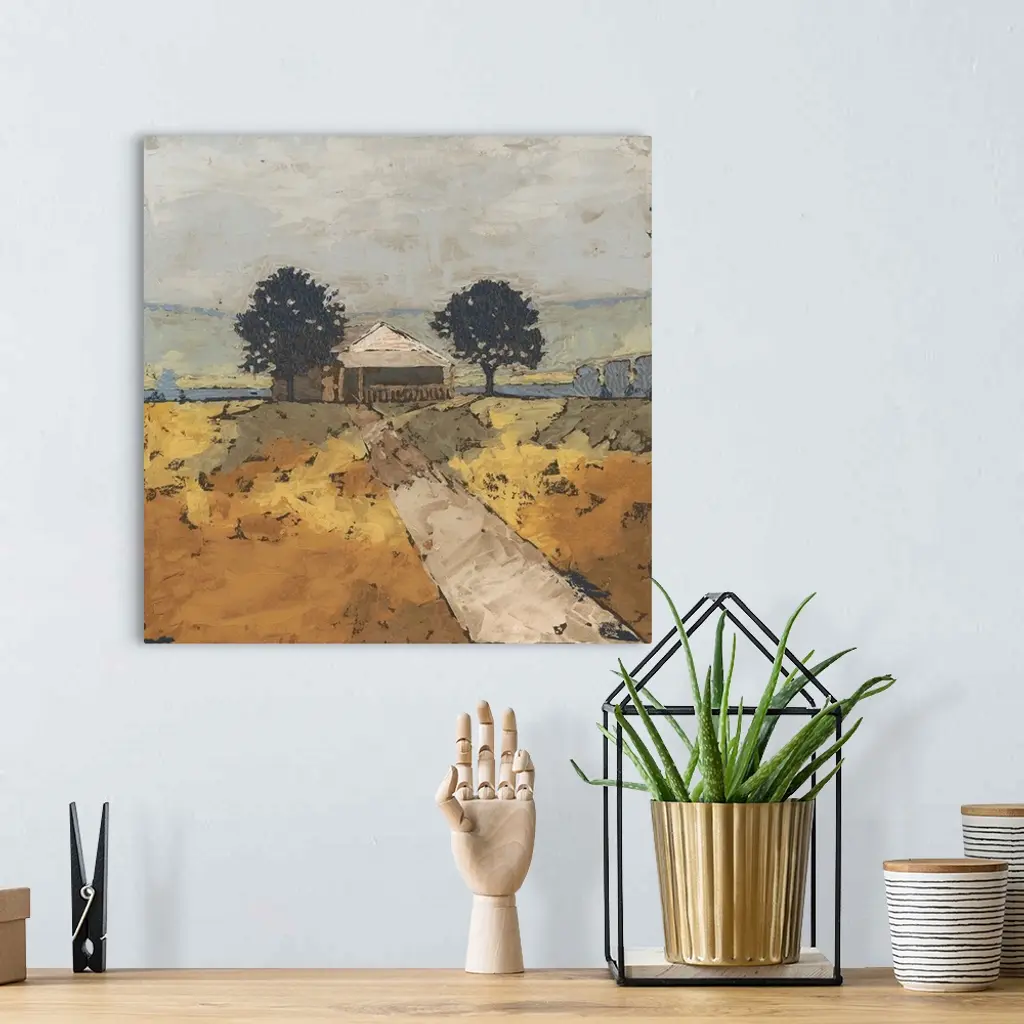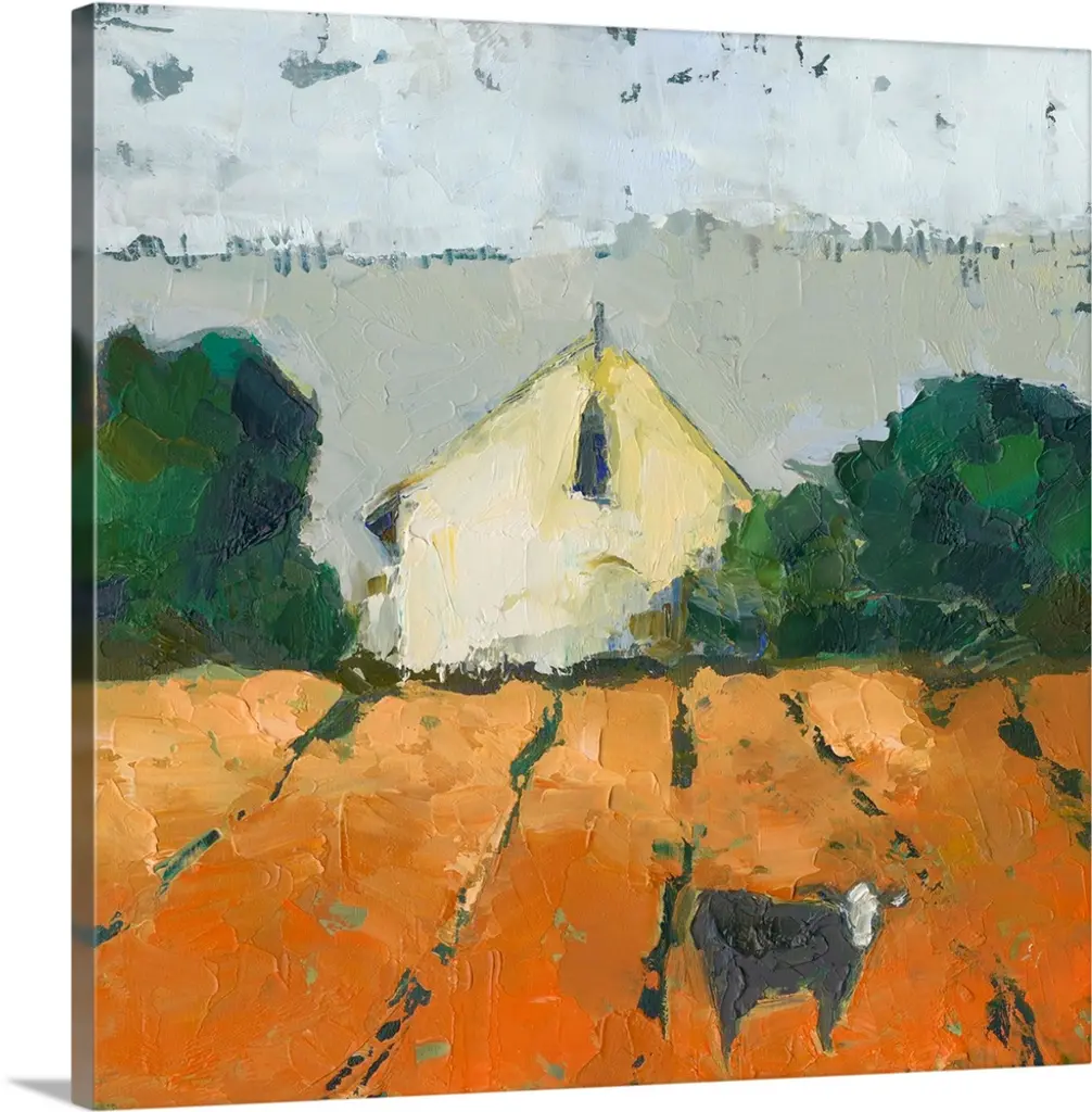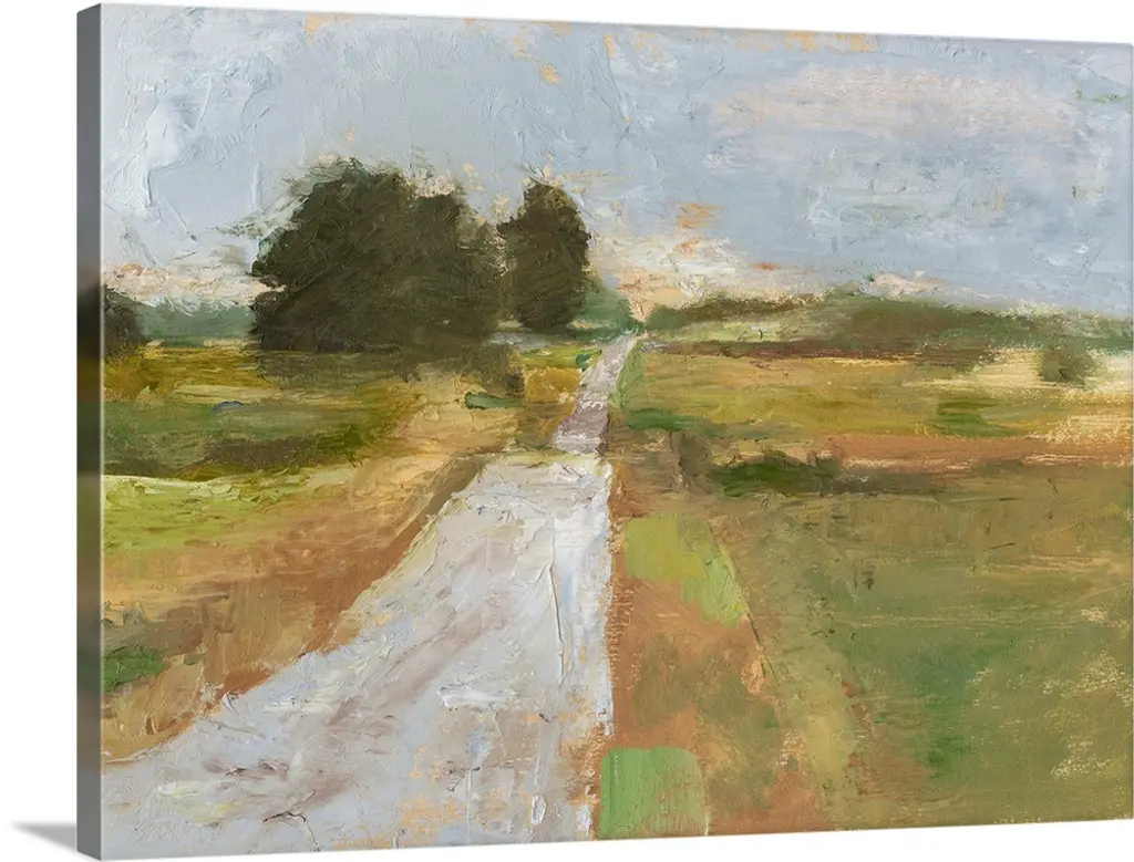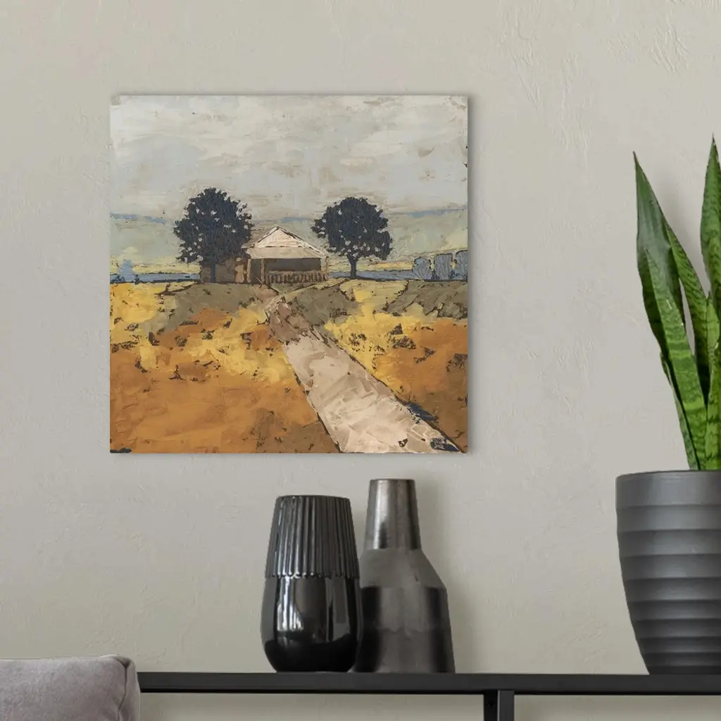Contemporary landscape painting of a serene countryside scene.