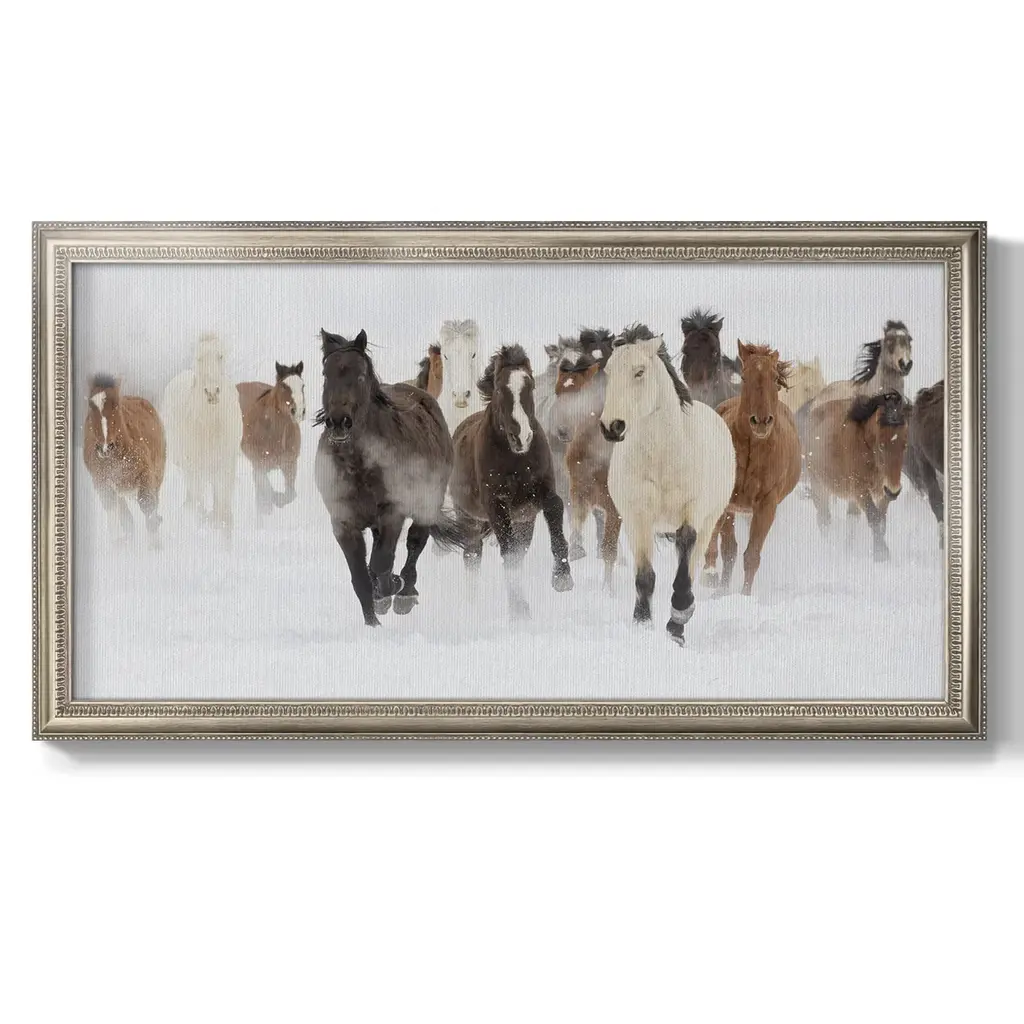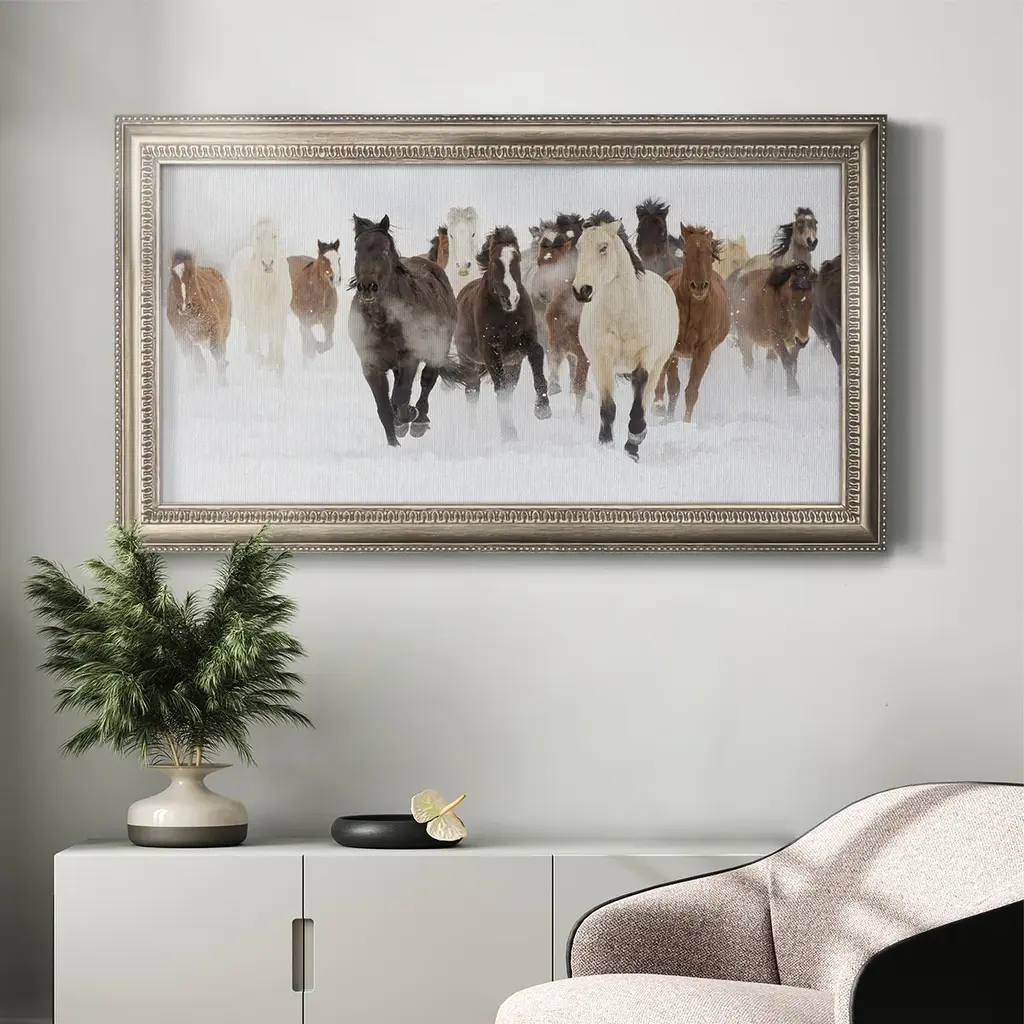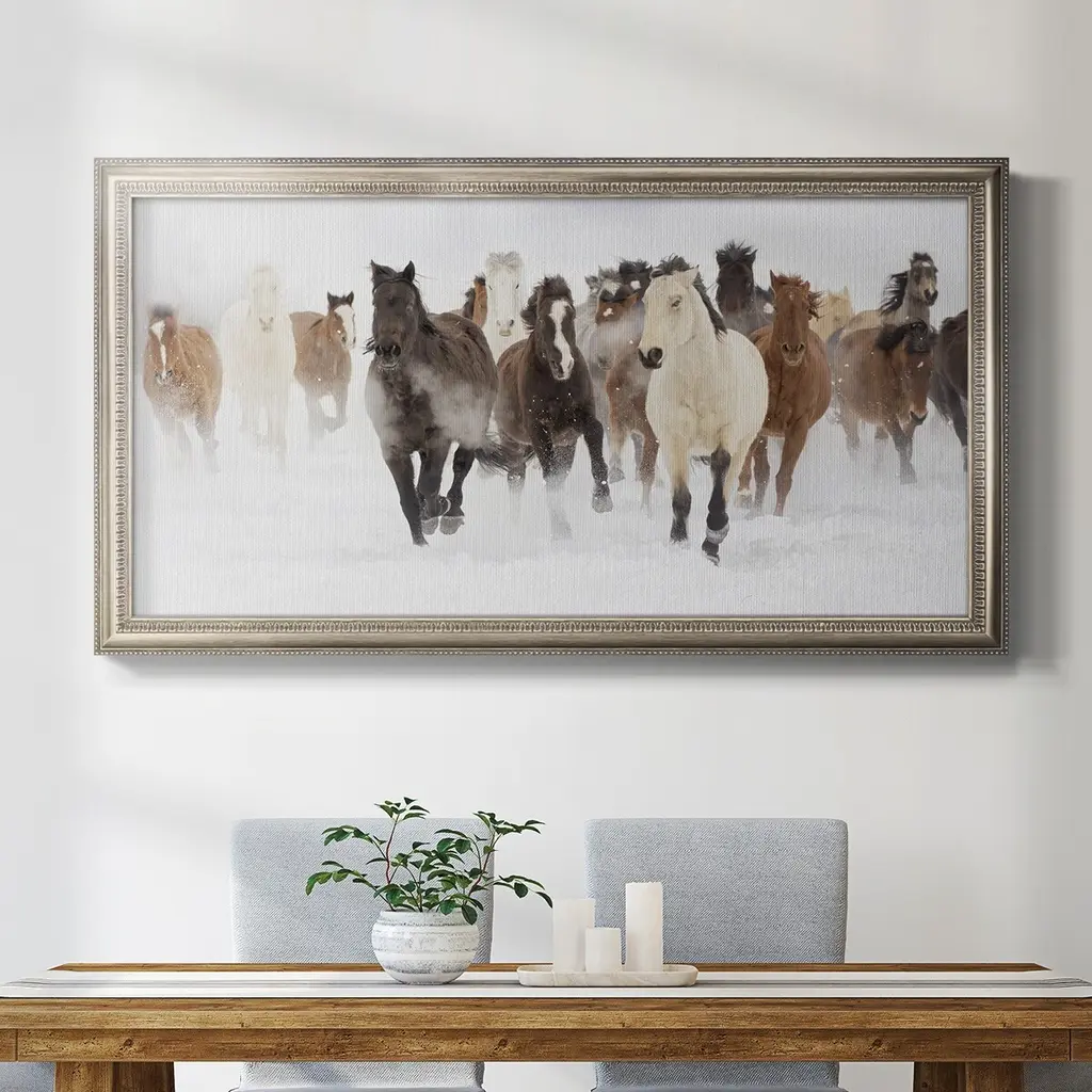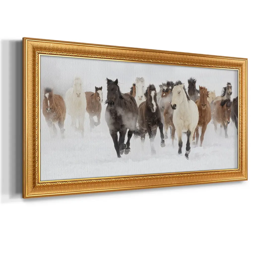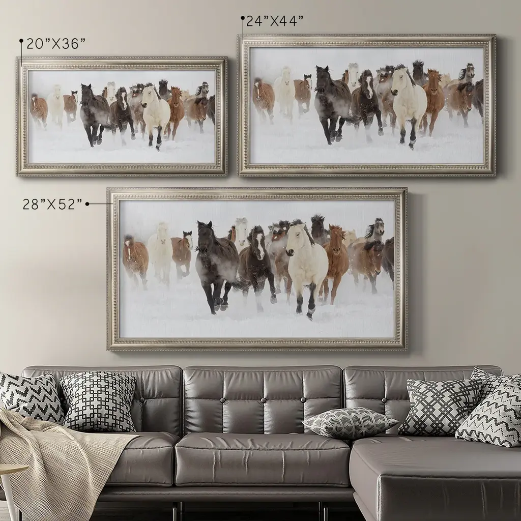 Pasture Run Premium Framed Canvas- Ready to Hang A Premium Framed Canvas created to last. Framed in distressed wood and available in an array of sizes and colors Featuring a beveled a solid wood stretcher bar, each piece comes ready to hand 3 SIZES AVAILABLE 21''X37'' - Overall Size 25''X45'' - Overall Size 29''x53'' - Overall Size Each piece is made to order. Each piece comes with hanging hardware. Made in the USA Ready to Hang Giclee Paper Print Acrylic Glass Beveled Matt Board