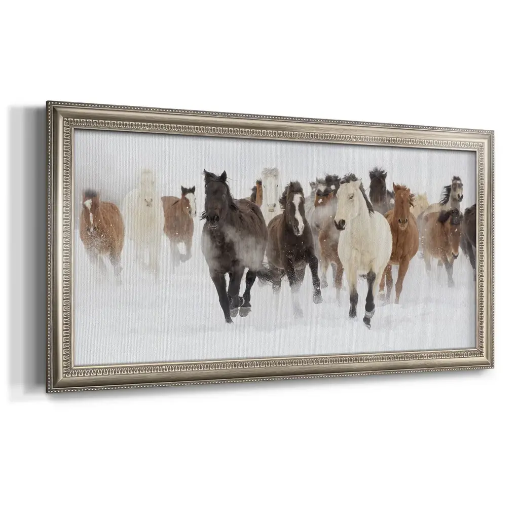Pasture Run Premium Framed Canvas- Ready to Hang A Premium Framed Canvas created to last. Framed in distressed wood and available in an array of sizes and colors Featuring a beveled a solid wood stretcher bar, each piece comes ready to hand 3 SIZES AVAILABLE 21''X37'' - Overall Size 25''X45'' - Overall Size 29''x53'' - Overall Size Each piece is made to order. Each piece comes with hanging hardware. Made in the USA Ready to Hang Giclee Paper Print Acrylic Glass Beveled Matt Board