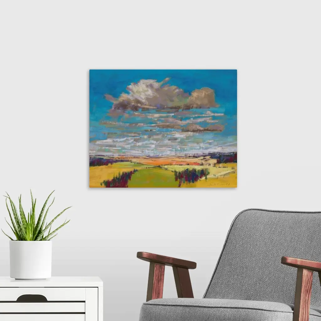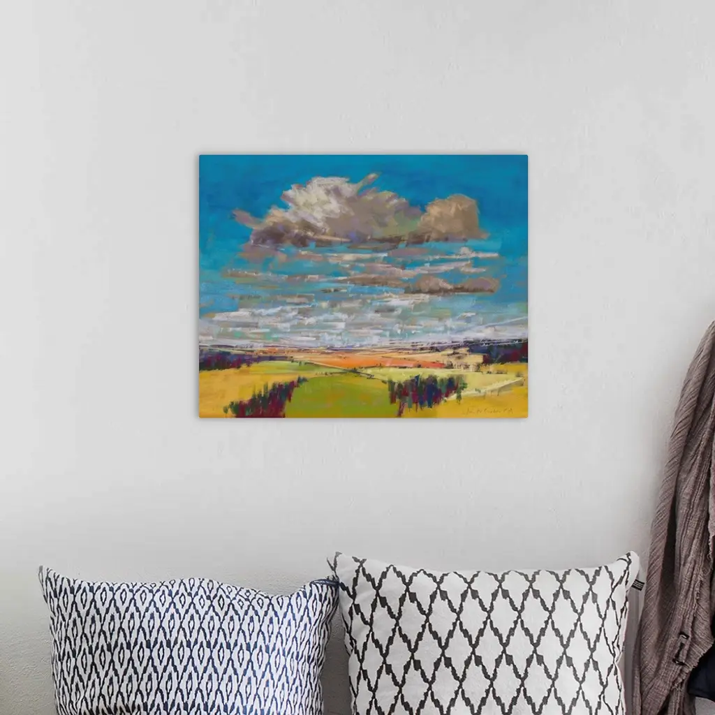 Pastel landscape painting of English countryside with trees, fields and clouds.