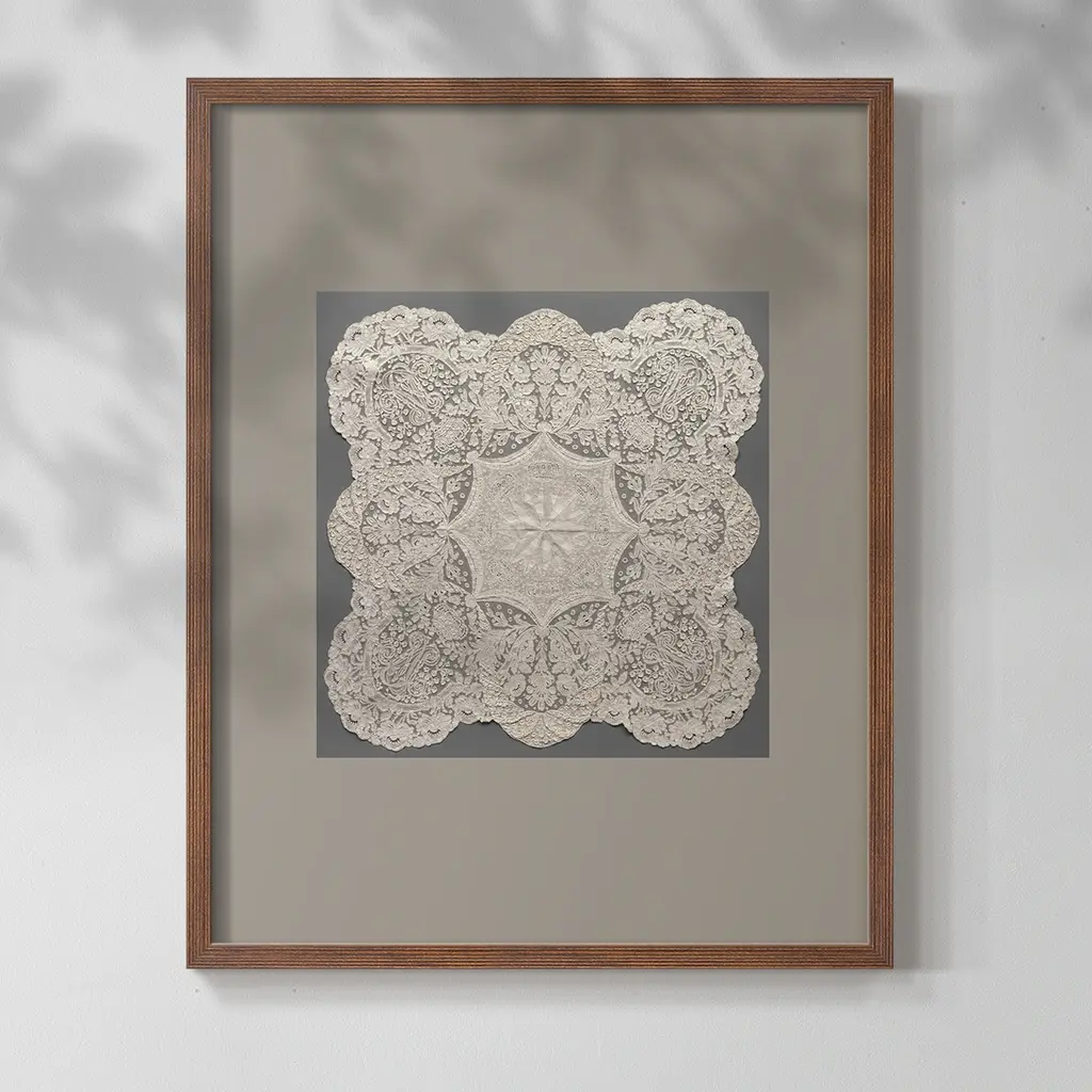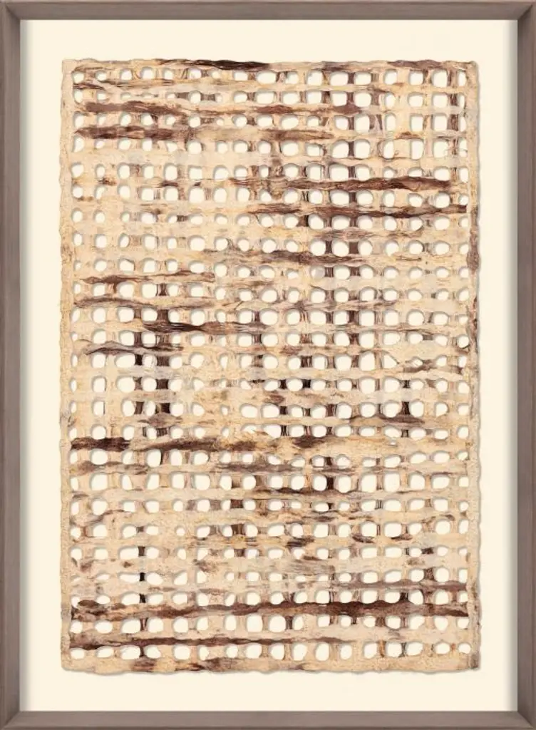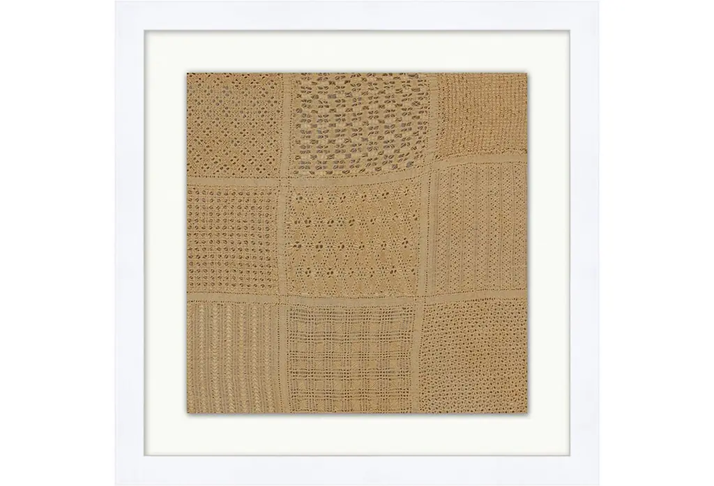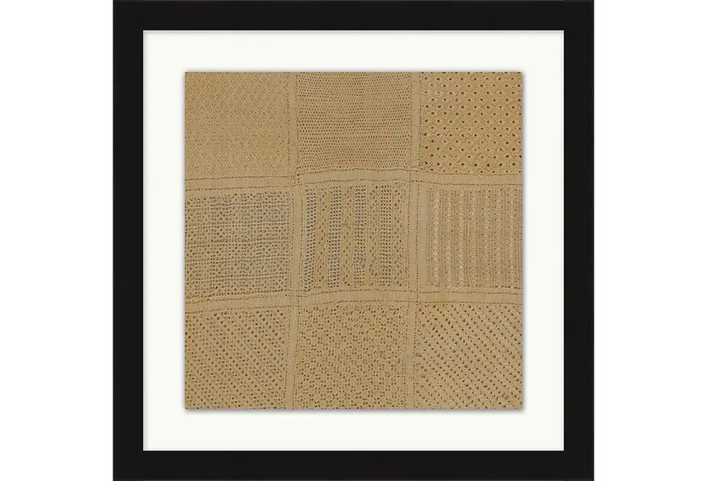 Designed by us and available only at One Kings Lane: This reproduction of an antique stitching sampler is printed on frayed raw canvas, sewn to an off-white mat, and displayed under glass in a ready-to-hang frame.