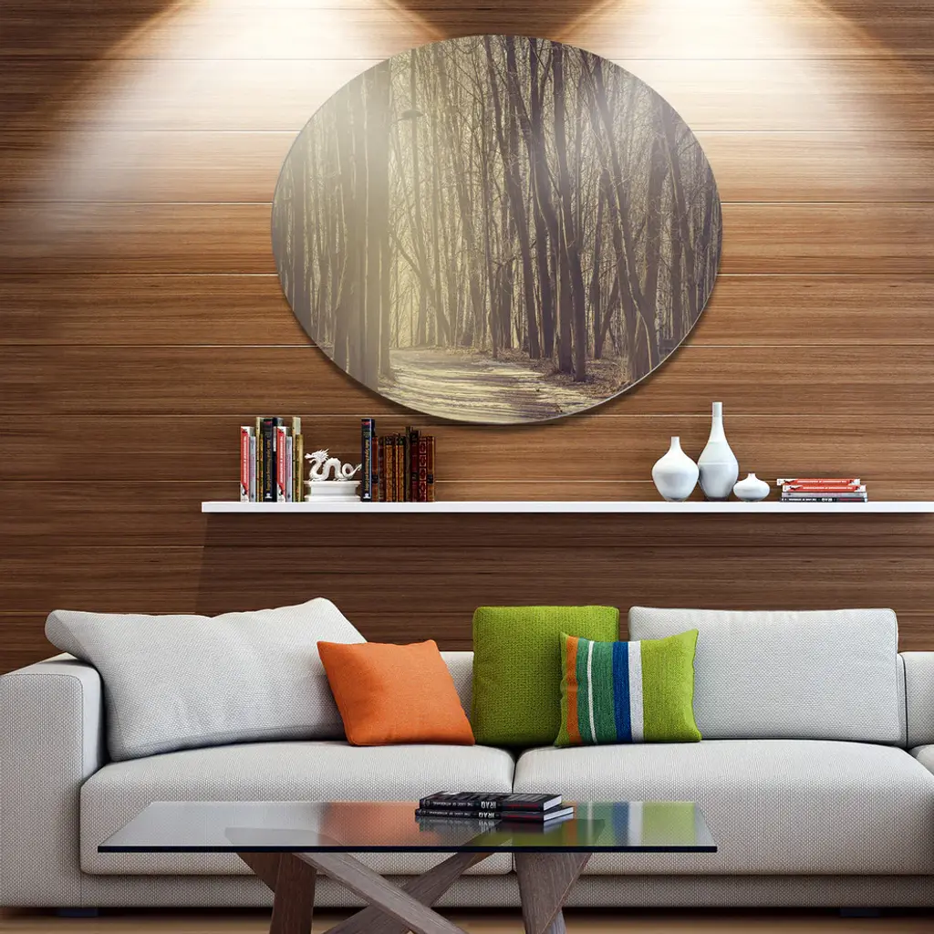 Bring Contemporary Abstraction to your home with this large Circle Metal wall art. This Path in the Foggy Fall Forest Metal Artwork makes it the focal point of any room or office. - White Gloss Coating ensures colors are extra vibrant with light reflection.- Aluminum grade Sheet Metal with 1 inch mounting frame on the back giving the illusion that the artwork is floating on the wall..- Mounting Brackets are included along with instructions.- High Quality Digital images are created directly into a glossy aluminum panel producing a stunning and captivating print into the glossy finish of the metal.- Water, Fire and Scratch resistant HD Aluminum panels.- Looks better than any photo paper and guaranteed to last at least 20 years- Easy to clean with a microfiber cloth. Colors are far superior to regular Canvas Art. - Easy to Hang
