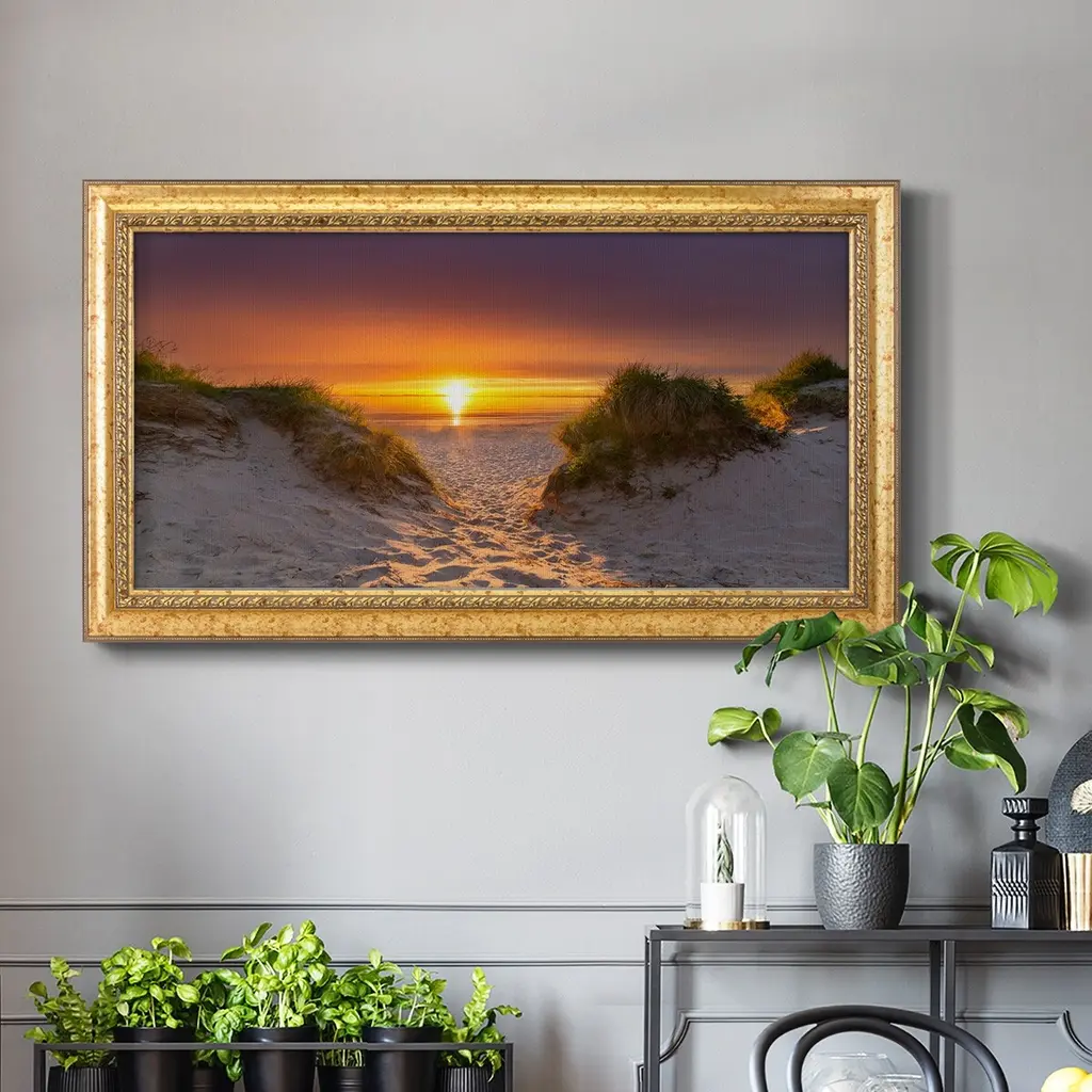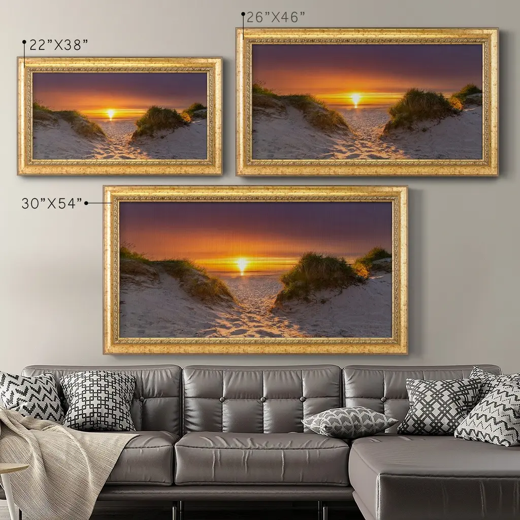 Path to Happiness Premium Framed Canvas- Ready to Hang A Premium Framed Canvas created to last. Framed in distressed wood and available in an array of sizes and colors Featuring a beveled a solid wood stretcher bar, each piece comes ready to hand 3 SIZES AVAILABLE 21''X37'' - Overall Size 25''X45'' - Overall Size 29''x53'' - Overall Size Each piece is made to order. Each piece comes with hanging hardware. Made in the USA Ready to Hang Giclee Paper Print Acrylic Glass Beveled Matt Board