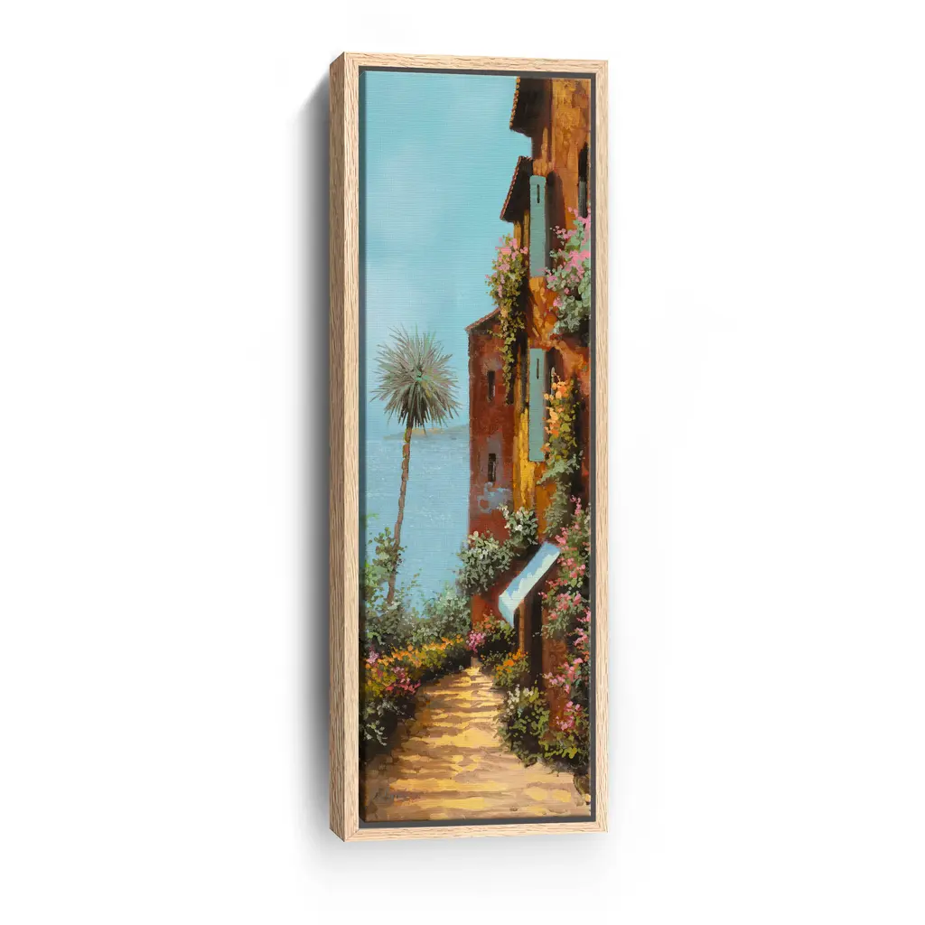 This coastal European scene bursts with sunlit charm - featuring terracotta walls, teal shutters, and lush blooms cascading toward a sparkling sea. The soft aqua sky and golden path evoke warmth, wanderlust, and the magic of summer by the coast. Our Gallery Wrap Canvas Prints are proudly assembled with high quality materials in California, USA. Each piece is printed on a thick, archival grade canvas using Giclee technology. It is then hand-stretched by our experienced artisans over solid wood bars, which will not warp over time. The final product is a piece personally crafted for you to confidently display on your wall. Care and Assembly: Ensure that the location of your piece has little to no exposure to heat, sunlight, and moisture. Wipe clean, only if needed. Each piece includes hanging hardware to hang on your wall vertically.