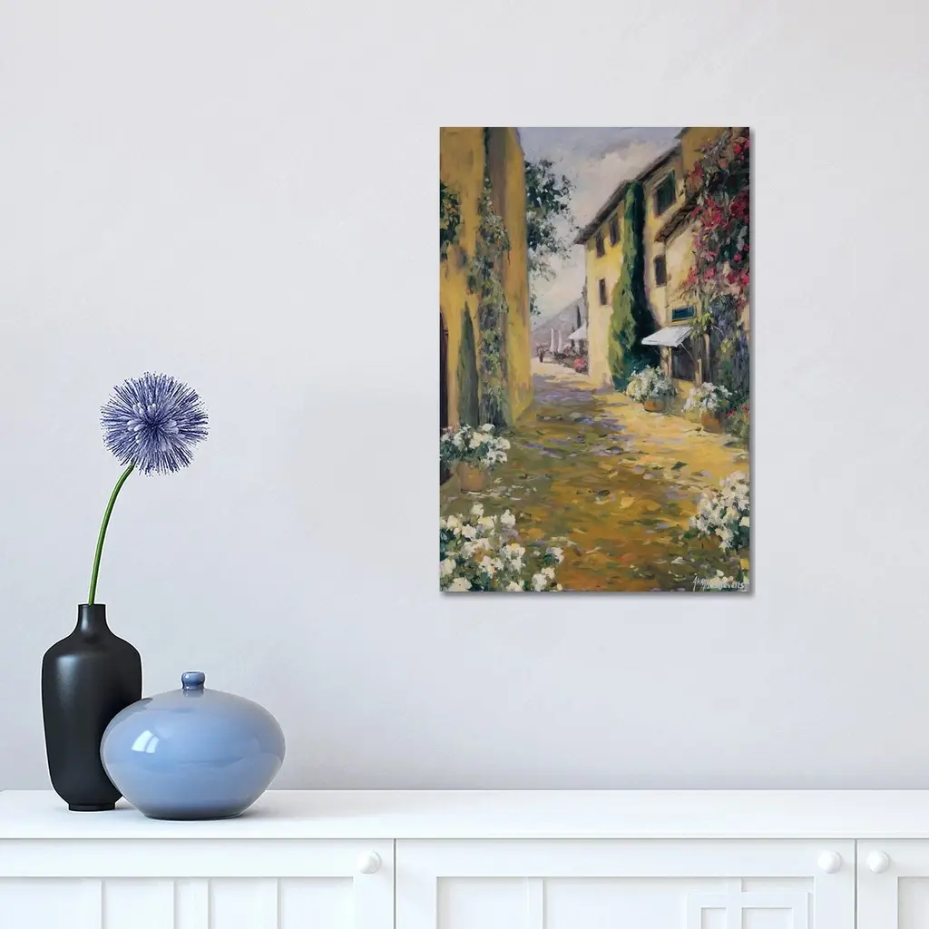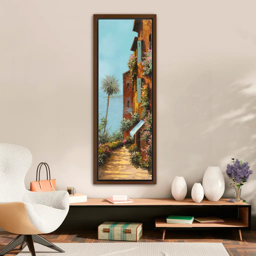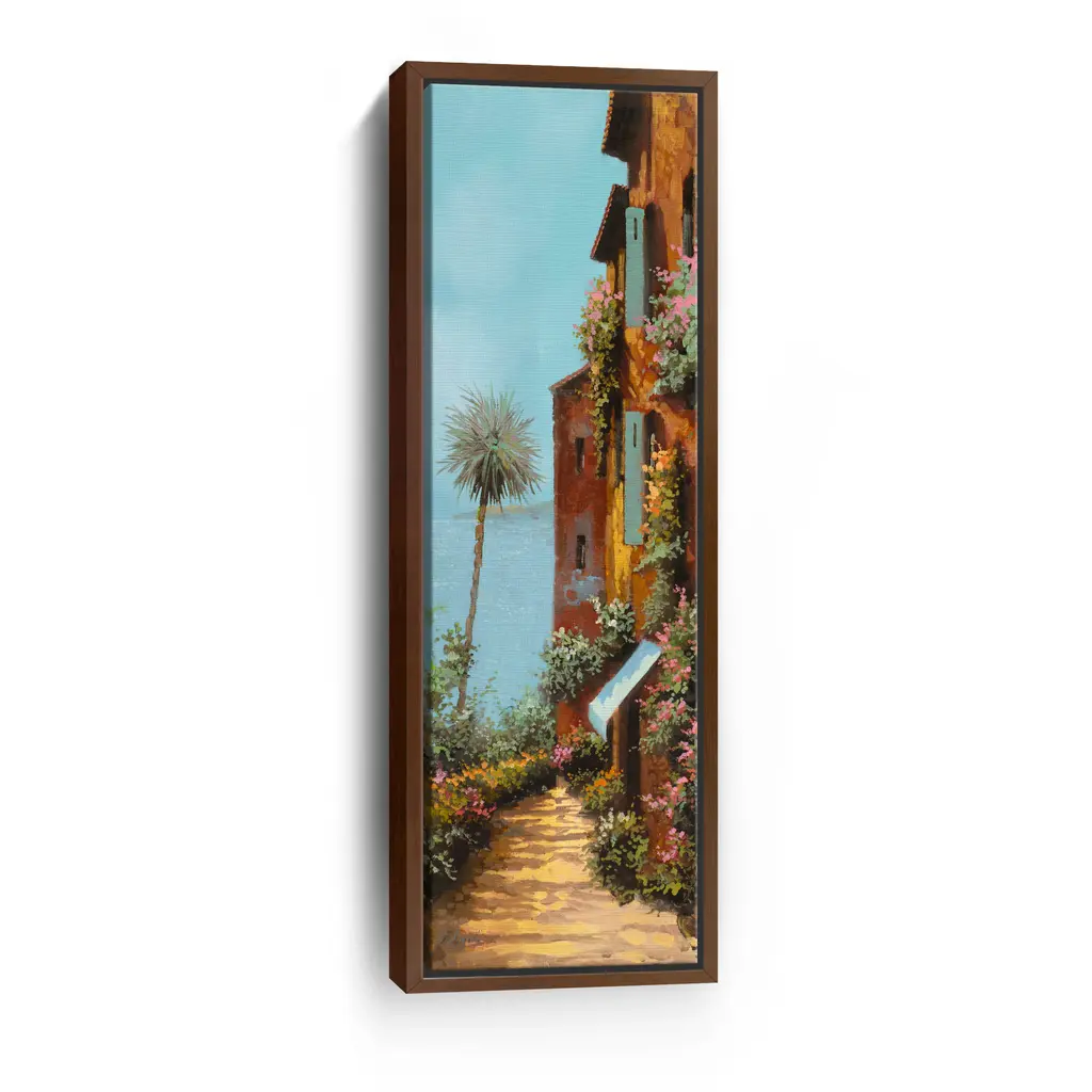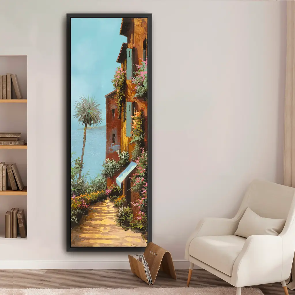 This coastal European scene bursts with sunlit charm - featuring terracotta walls, teal shutters, and lush blooms cascading toward a sparkling sea. The soft aqua sky and golden path evoke warmth, wanderlust, and the magic of summer by the coast. Our Gallery Wrap Canvas Prints are proudly assembled with high quality materials in California, USA. Each piece is printed on a thick, archival grade canvas using Giclee technology. It is then hand-stretched by our experienced artisans over solid wood bars, which will not warp over time. The final product is a piece personally crafted for you to confidently display on your wall. Care and Assembly: Ensure that the location of your piece has little to no exposure to heat, sunlight, and moisture. Wipe clean, only if needed. Each piece includes hanging hardware to hang on your wall vertically.