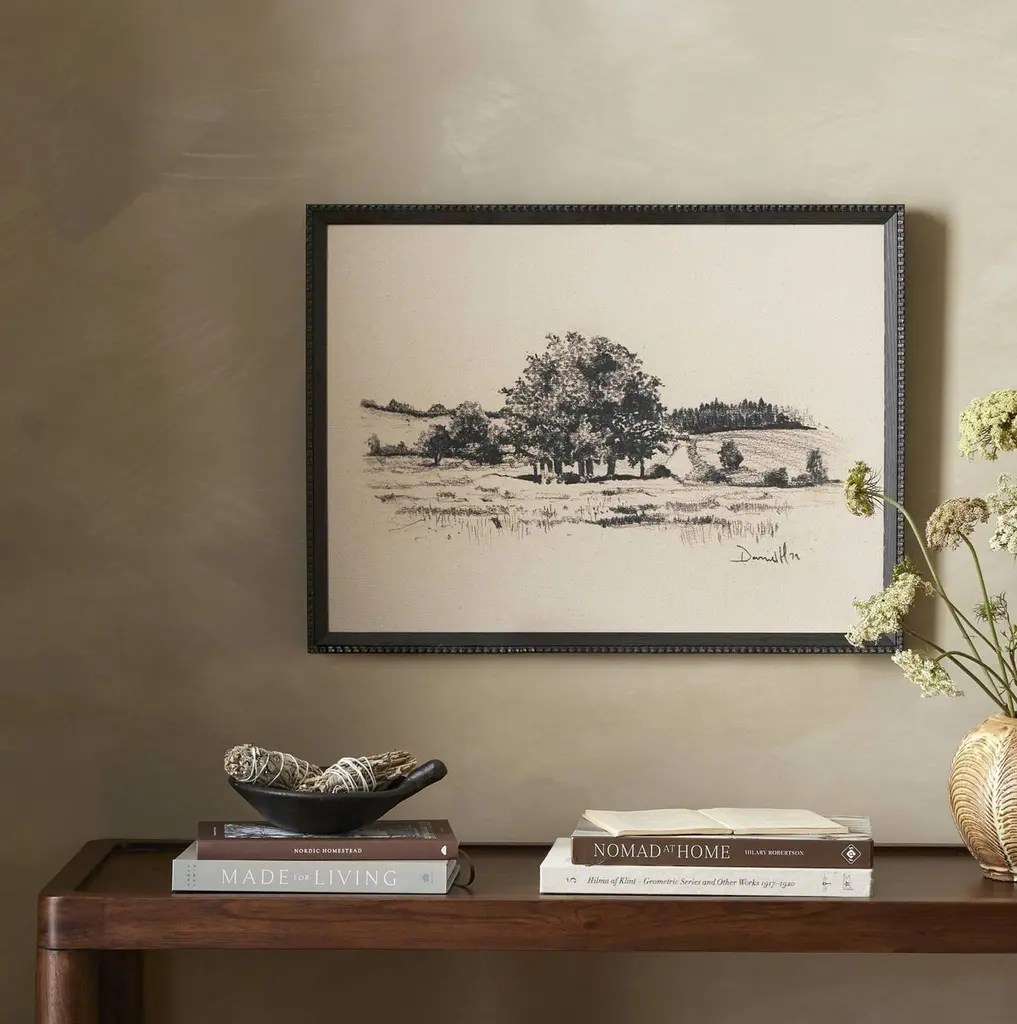 Artist Dan Hobday finds inspiration in the coastal landscapes of his hometown of Devon, England, crafting this hand-drawn, sketched-style nature vignette. Finished within a decorative frame of naturally distressed painted pine. Handmade in Austin, Texas.