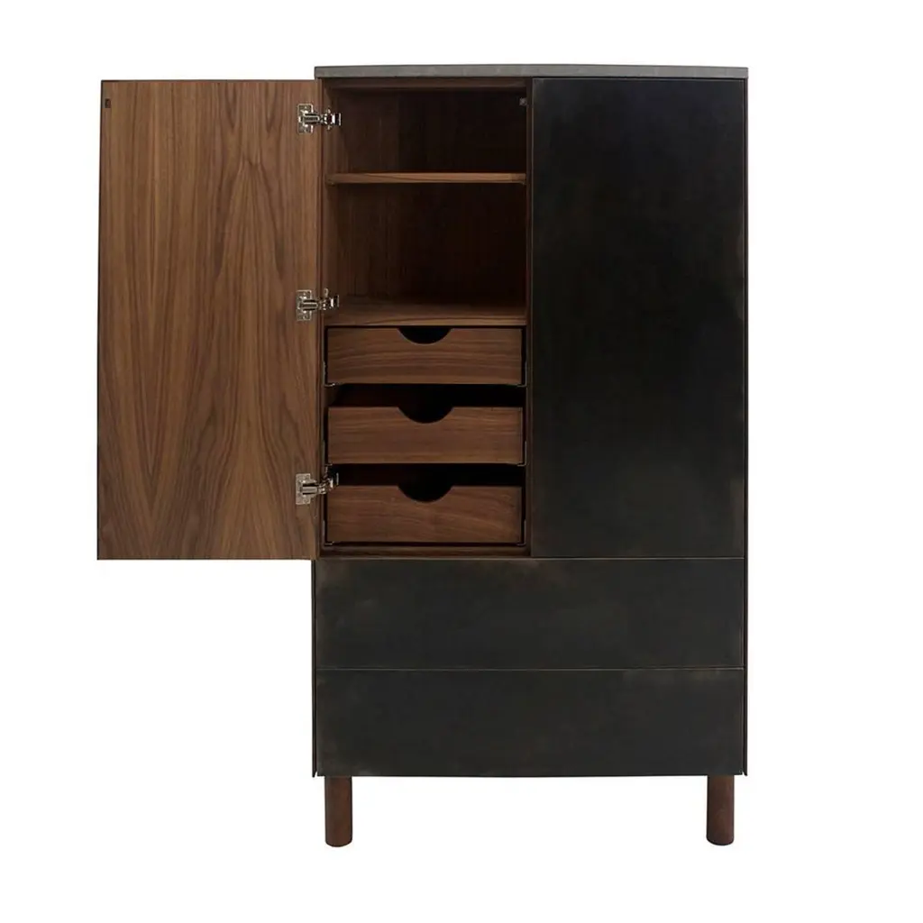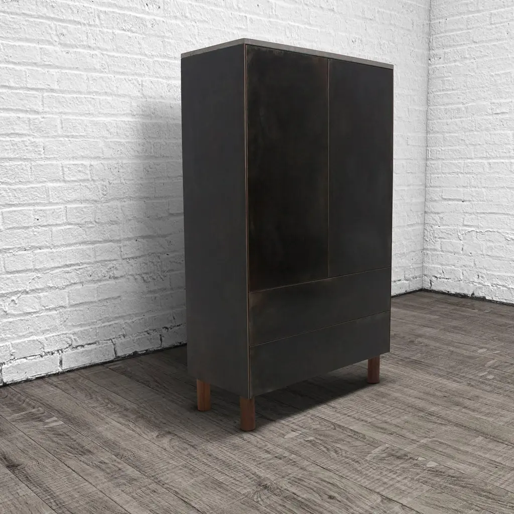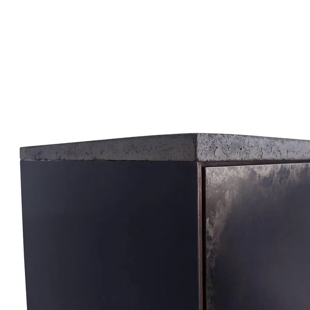This cabinet combines three elemental materials, concrete, steel and wood to create a grounded, but elegant piece of furniture. The fascia is cold-rolled steel laminated to a walnut veneer core. The cabinet is topped with a cast-concrete slab. Stefan Rurak transforms the steel, a characteristically cold material, to project warmth and vibration, by applying his unique process that combines painting with a range of black oxides and fire. The final result is a vibrating, textured surface that has been "patinated". The piece features adjustable shelves and tip-on hardware. The cabinet has five solid walnut wood dovetailed drawers, hand-turned solid walnut wood legs complete the piece.