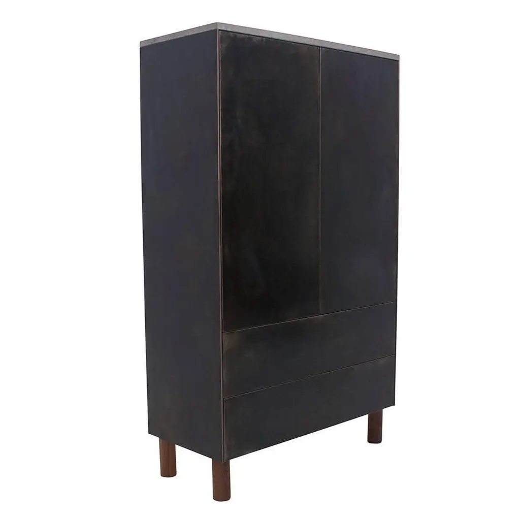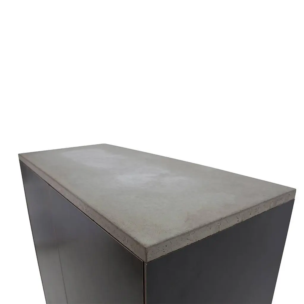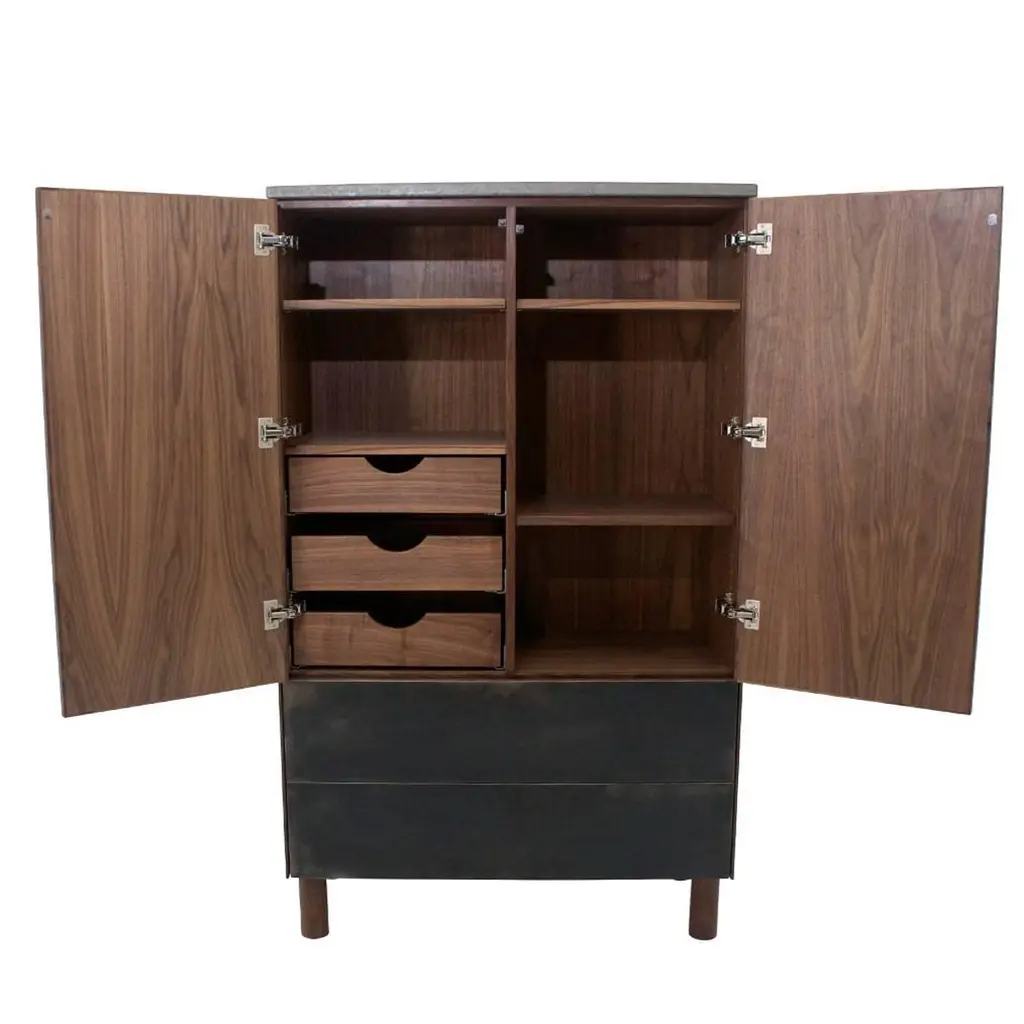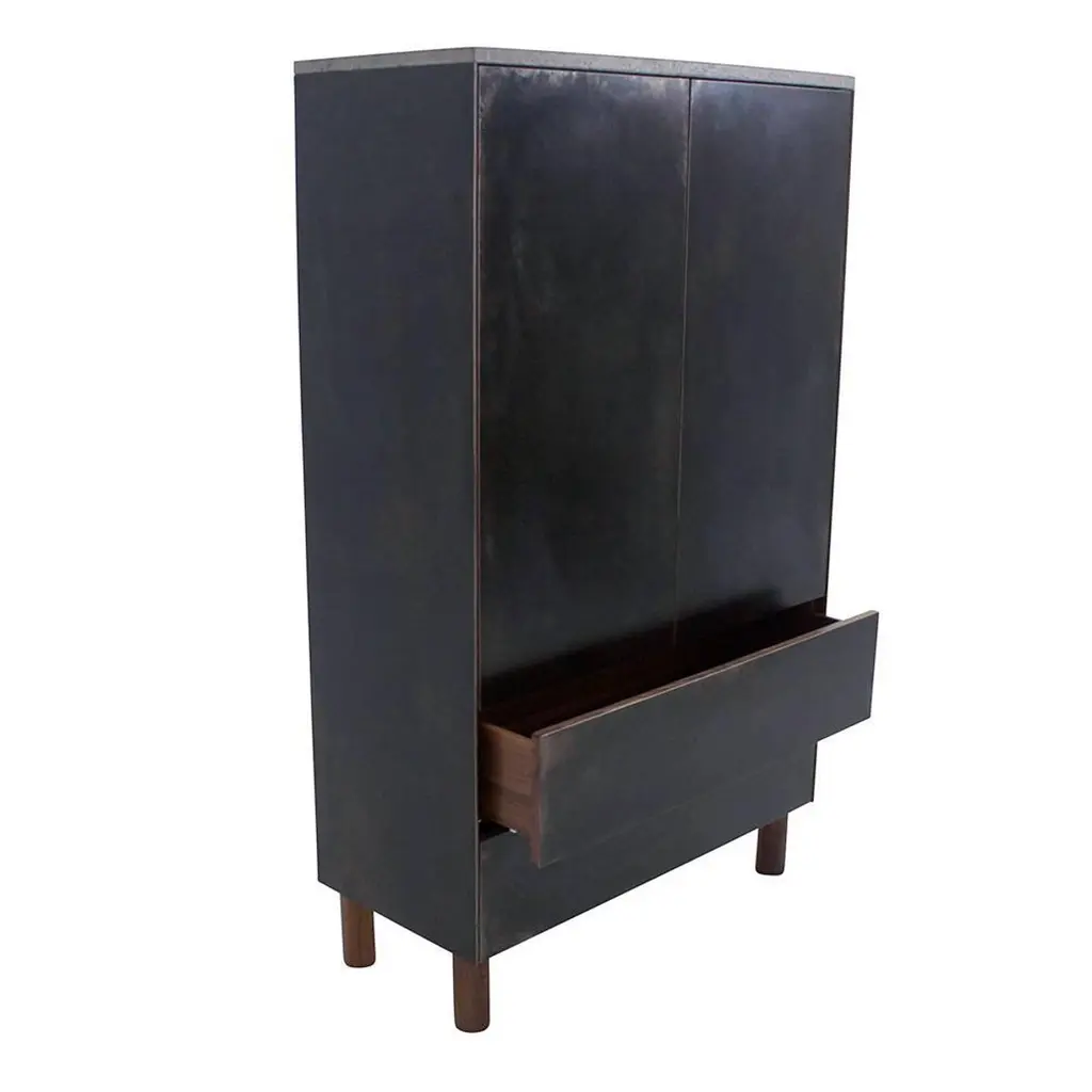 This cabinet combines three elemental materials, concrete, steel and wood to create a grounded, but elegant piece of furniture. The fascia is cold-rolled steel laminated to a walnut veneer core. The cabinet is topped with a cast-concrete slab. Stefan Rurak transforms the steel, a characteristically cold material, to project warmth and vibration, by applying his unique process that combines painting with a range of black oxides and fire. The final result is a vibrating, textured surface that has been "patinated". The piece features adjustable shelves and tip-on hardware. The cabinet has five solid walnut wood dovetailed drawers, hand-turned solid walnut wood legs complete the piece.