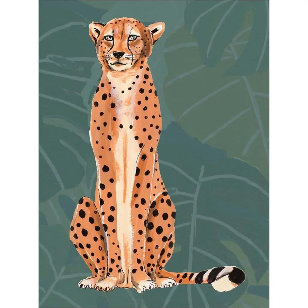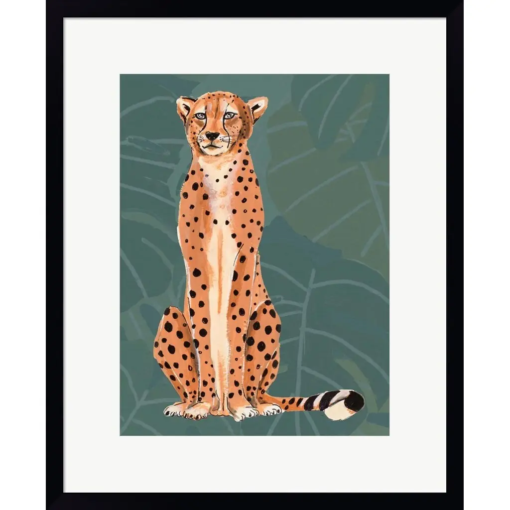 Cheetah Retro On Leaf Pattern by Patricia Pinto is a high quality piece of framed artwork. The finished size of this piece is 18" x 22". It has a Petite Black with Flat Front frame, White mat and is finished with high quality Acrylic Plexiglass. 100% Satisfaction Guaranteed.