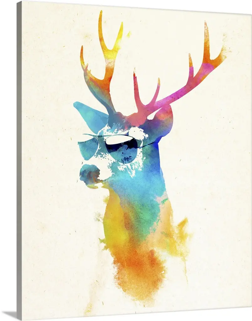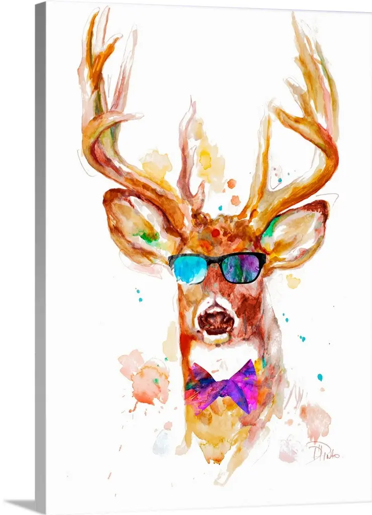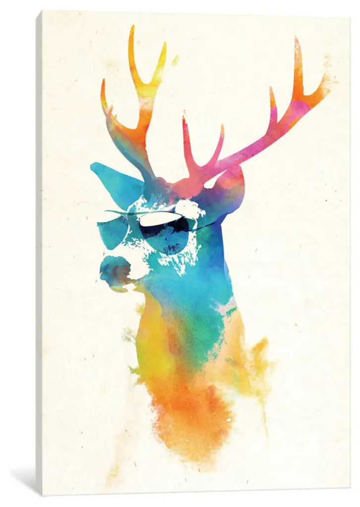 Cool Deer by Patricia Pinto is a high quality piece of canvas artwork. The finished size of this piece is 12" X 12", and it has a depth 1.5" with black painted sides. There is a UV protective coating over the entire image, and it is ready to hang on your wall with no hardware required.