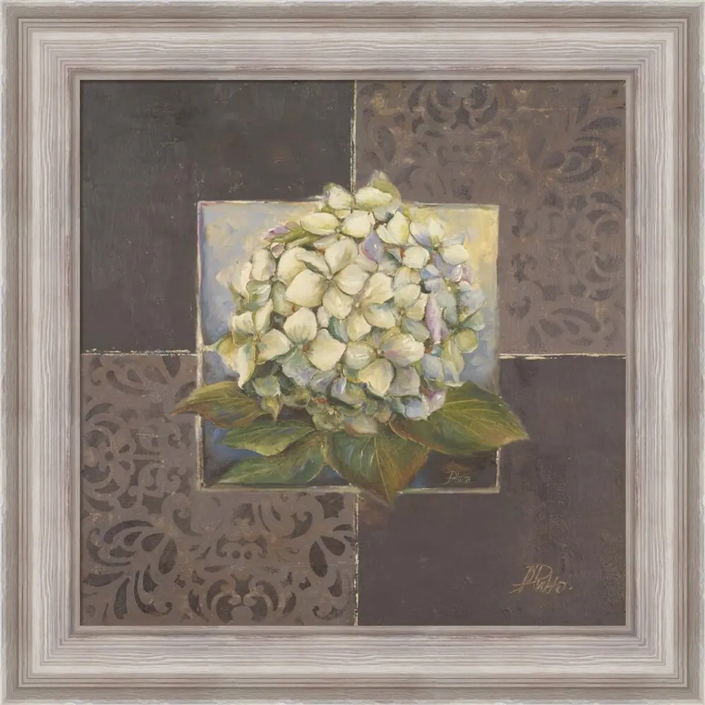 Hydrangeas on Brown II by Patricia Pinto is a high quality piece of framed artwork. The finished size of this piece is 20" X 20". It has a Weathered White Distressed frame and is finished with high quality Acrylic Plexiglass.. 100% Satisfaction Guaranteed.