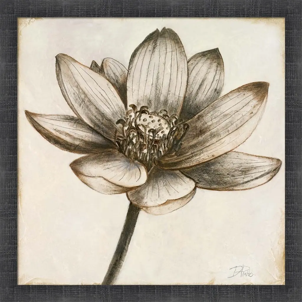 Sepia Lotus II by Patricia Pinto is a high quality piece of framed artwork. The finished size of this piece is 17.5" X 17.5". It has a Rustic Grey Distressed frame and is finished with high quality Acrylic Plexiglass.. 100% Satisfaction Guaranteed.