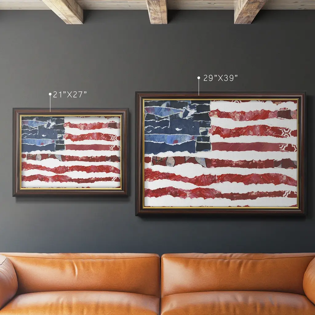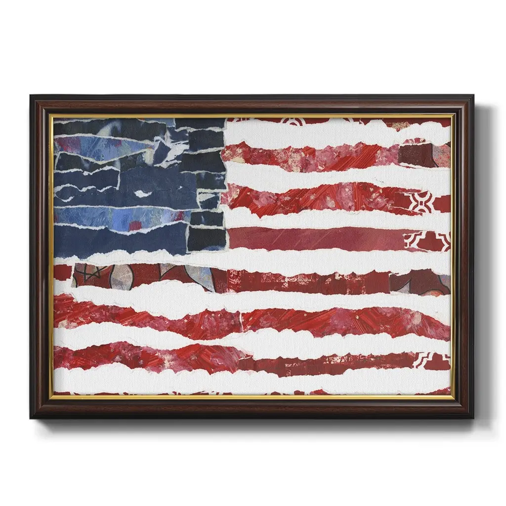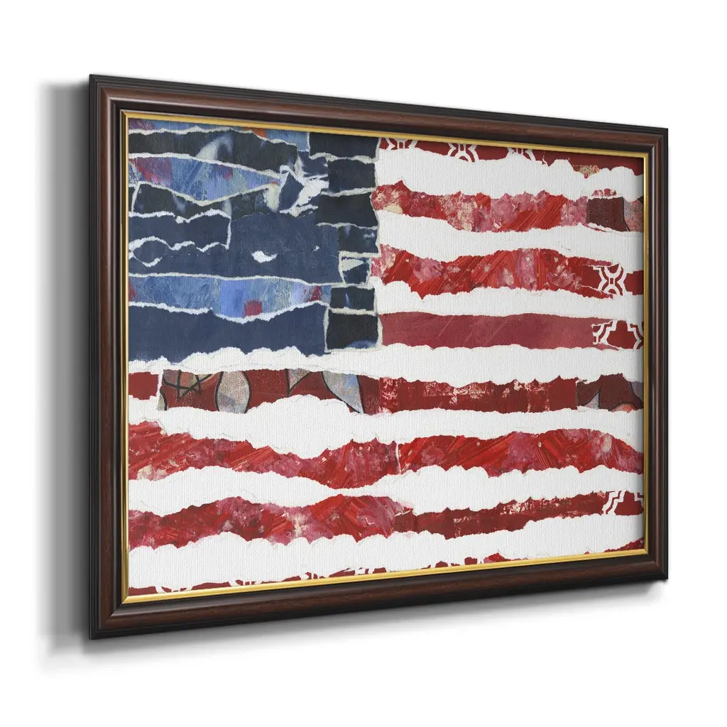 Patriotic Collage Flag I Premium Framed Canvas- Ready to Hang A Premium Framed Canvas created to last. Framed in distressed wood and available in an array of sizes and colors Featuring a beveled a solid wood stretcher bar, each piece comes ready to hand 3 SIZES AVAILABLE 16''X20'' - Overall Size 18'X27'' - Overall Size 24''x36'' - Overall Size Each piece is made to order. Each piece comes with hanging hardware. Made in the USA Ready to Hang Giclee Paper Print Acrylic Glass Beveled Matt Board