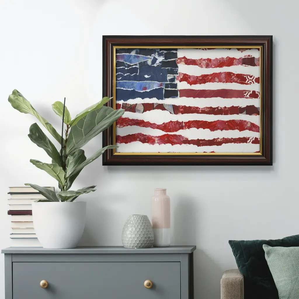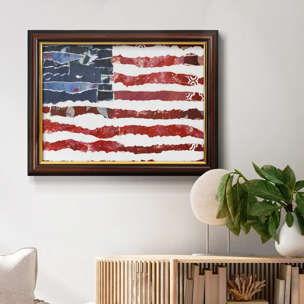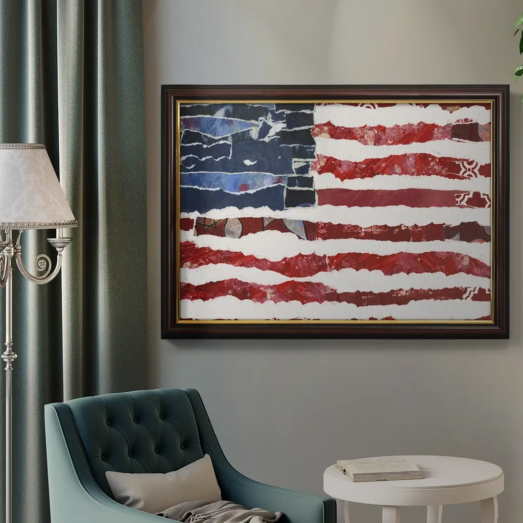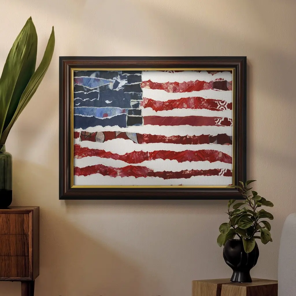 Patriotic Collage Flag I Premium Framed Canvas- Ready to Hang A Premium Framed Canvas created to last. Framed in distressed wood and available in an array of sizes and colors Featuring a beveled a solid wood stretcher bar, each piece comes ready to hand 3 SIZES AVAILABLE 16''X20'' - Overall Size 18'X27'' - Overall Size 24''x36'' - Overall Size Each piece is made to order. Each piece comes with hanging hardware. Made in the USA Ready to Hang Giclee Paper Print Acrylic Glass Beveled Matt Board
