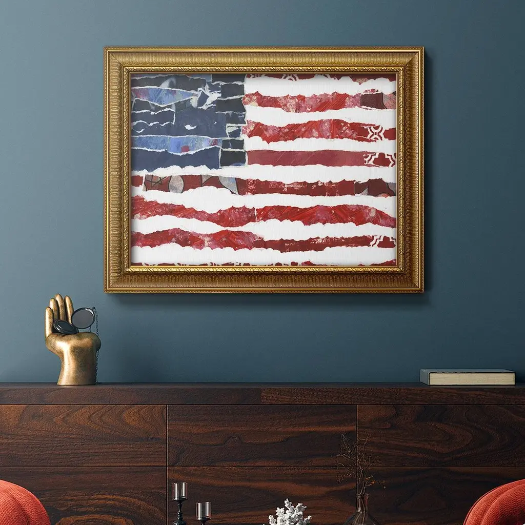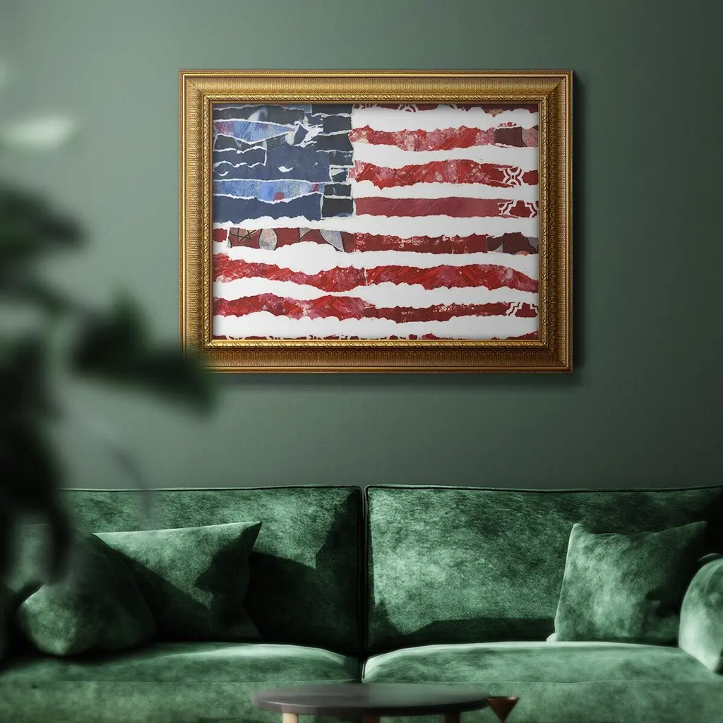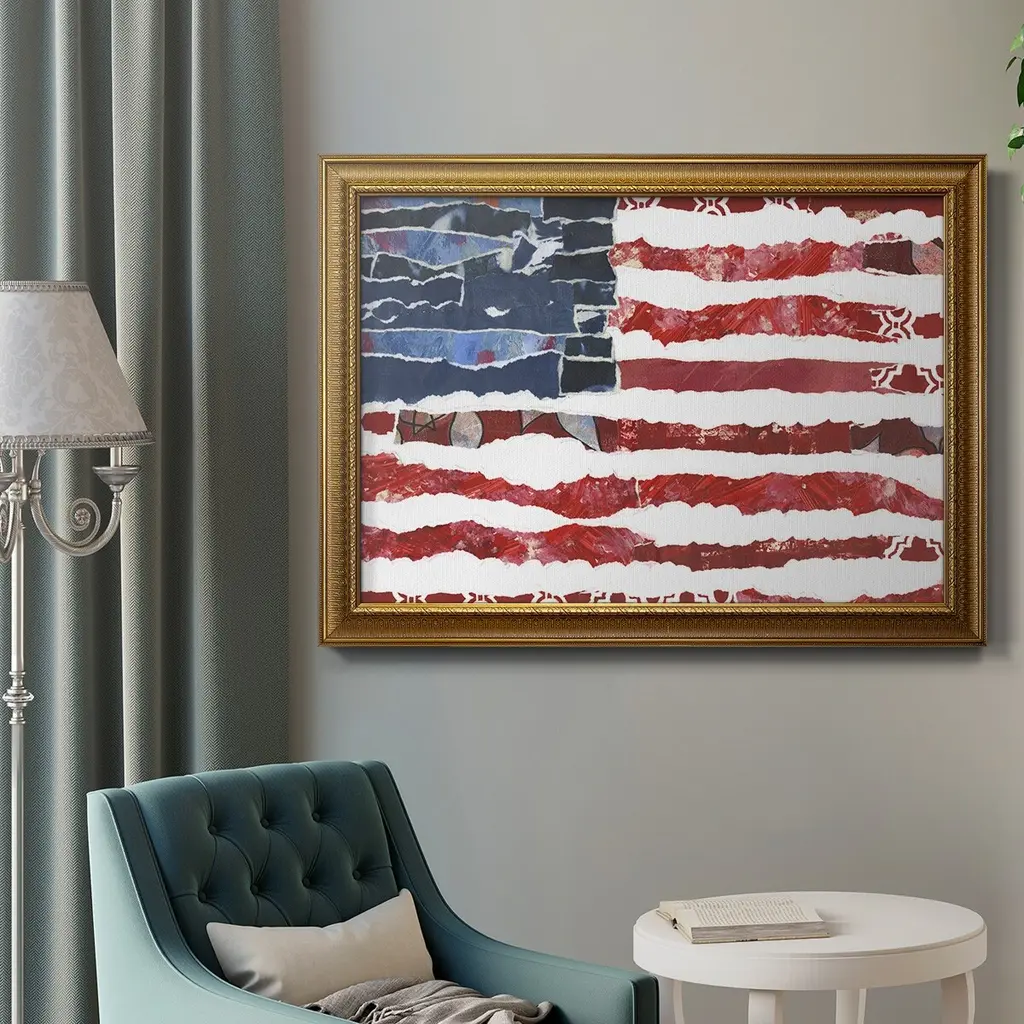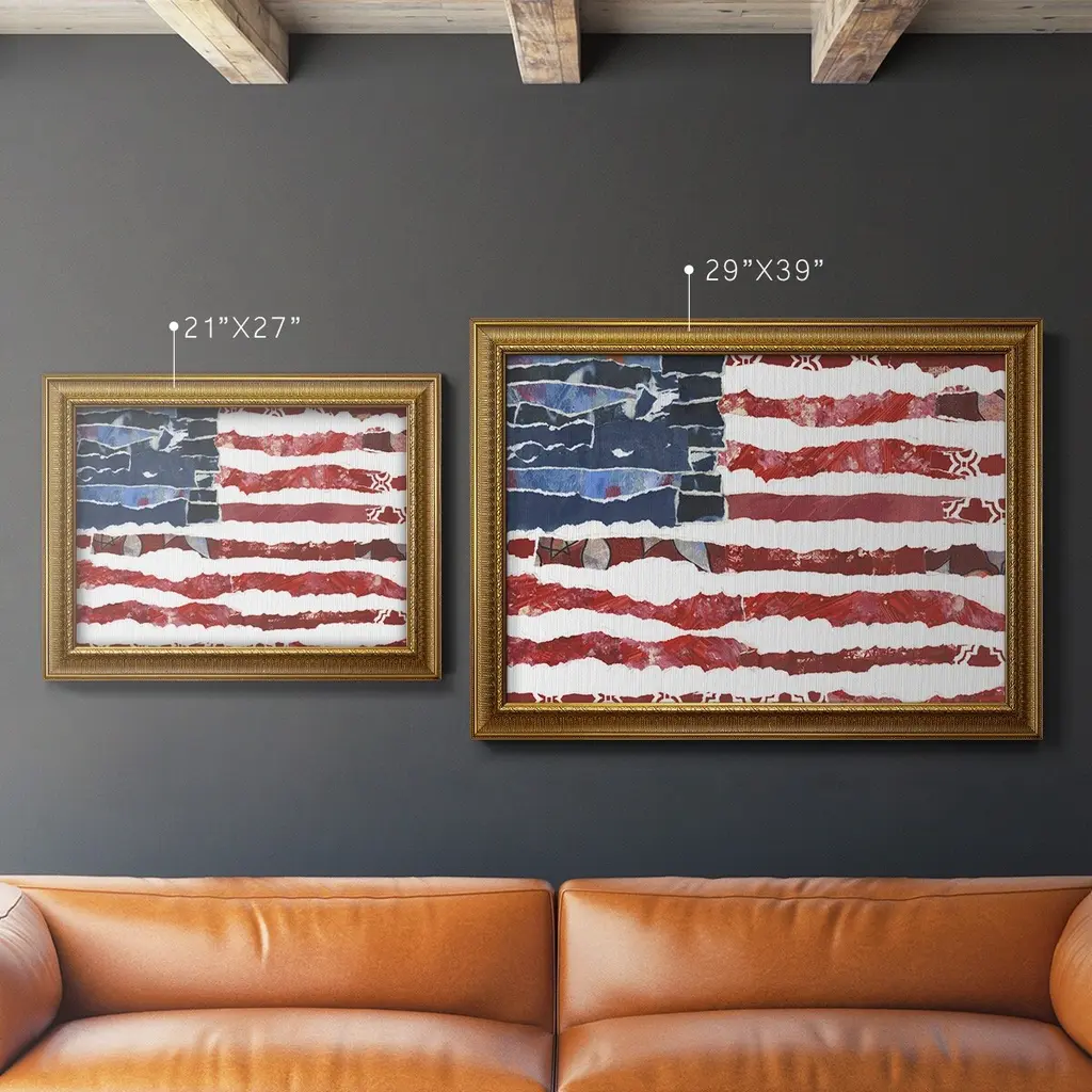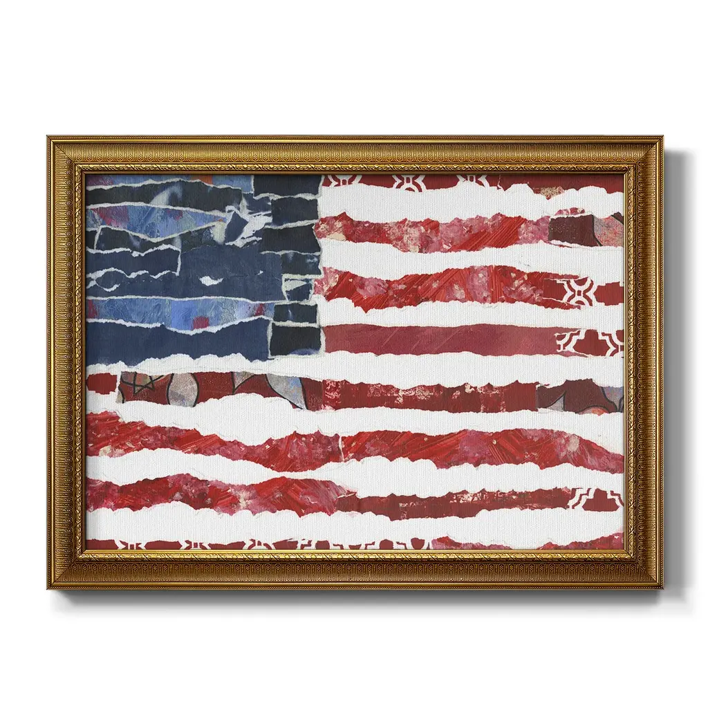 Patriotic Collage Flag I Premium Framed Canvas- Ready to Hang A Premium Framed Canvas created to last. Framed in distressed wood and available in an array of sizes and colors Featuring a beveled a solid wood stretcher bar, each piece comes ready to hand 3 SIZES AVAILABLE 16''X20'' - Overall Size 18'X27'' - Overall Size 24''x36'' - Overall Size Each piece is made to order. Each piece comes with hanging hardware. Made in the USA Ready to Hang Giclee Paper Print Acrylic Glass Beveled Matt Board