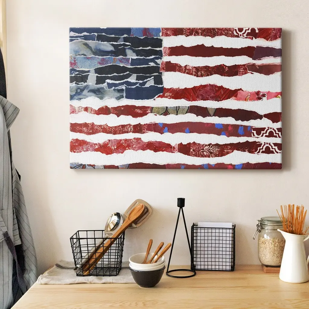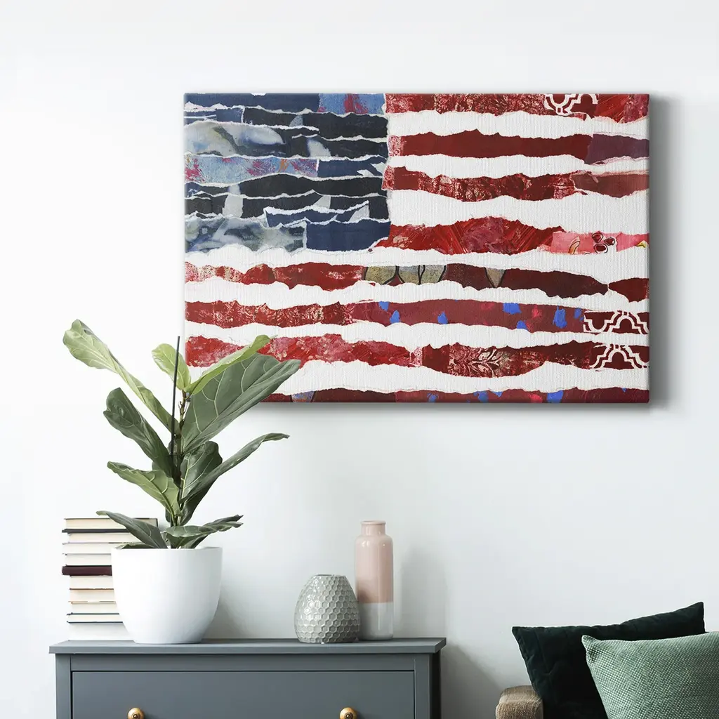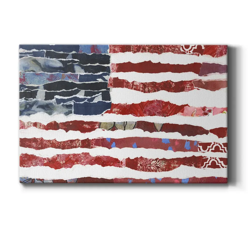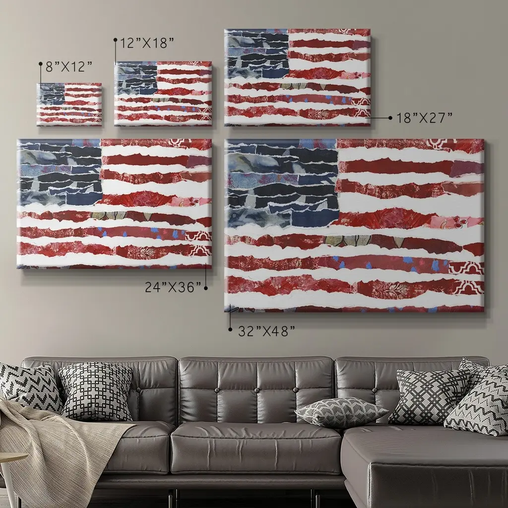 Patriotic Collage Flag II Premium Gallery Wrapped Canvas - Ready to Hang A premium hand stretched gallery wrapped canvas print created to last. Featuring a beveled a solid wood stretcher bar, each piece comes ready to hand 6 SIZES AVAILABLE 8''X12'' - Overall Size 12''X18'' - Overall Size 18''X27'' - Overall Size 24''x36'' - Overall Size 32''x48'' - Overall Size 40''x60'' - Overall Size Each piece is made to order. Built to Last Each piece comes ready to hang Solid wood stretcher Fade and Water resistant Made domestically
