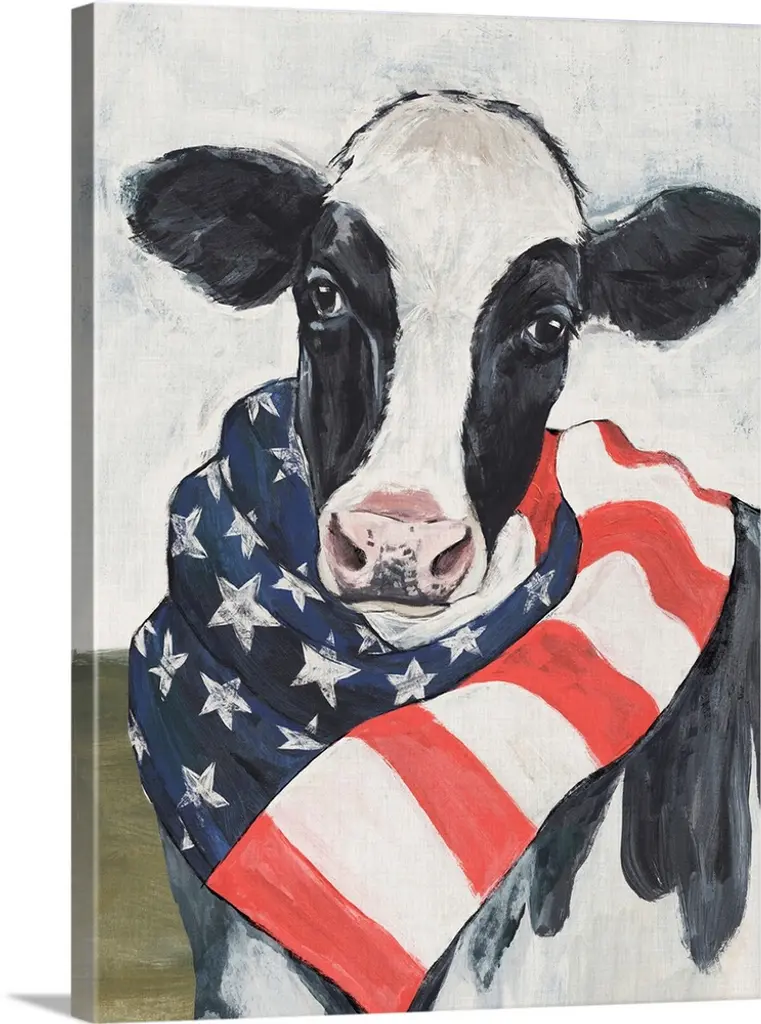 Square painting of a black and white spotted cow on a gray and white star patterned background.