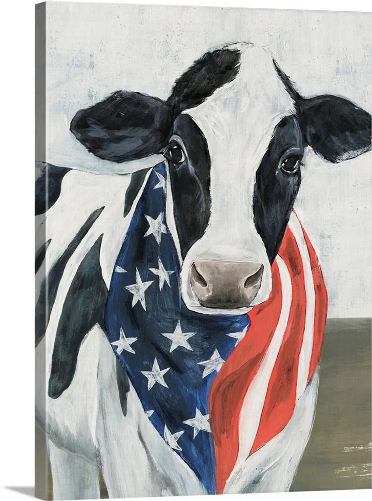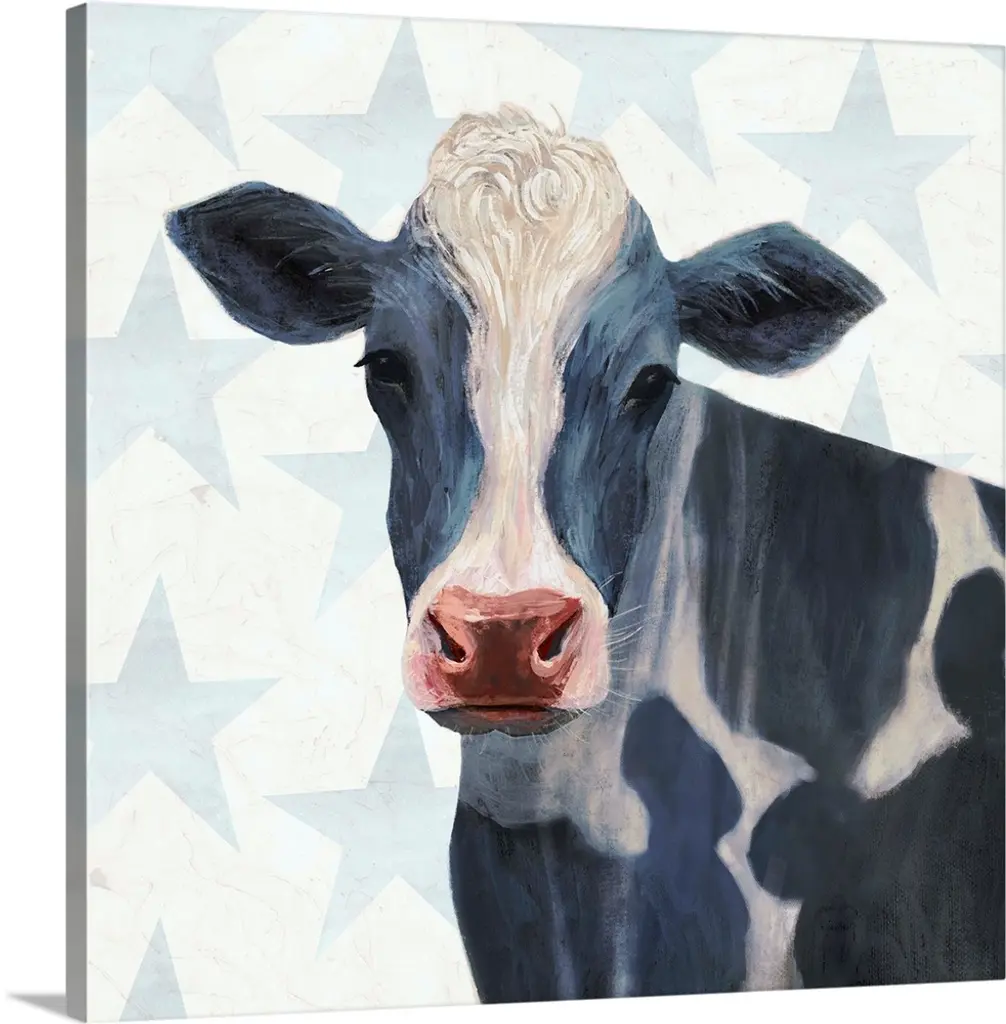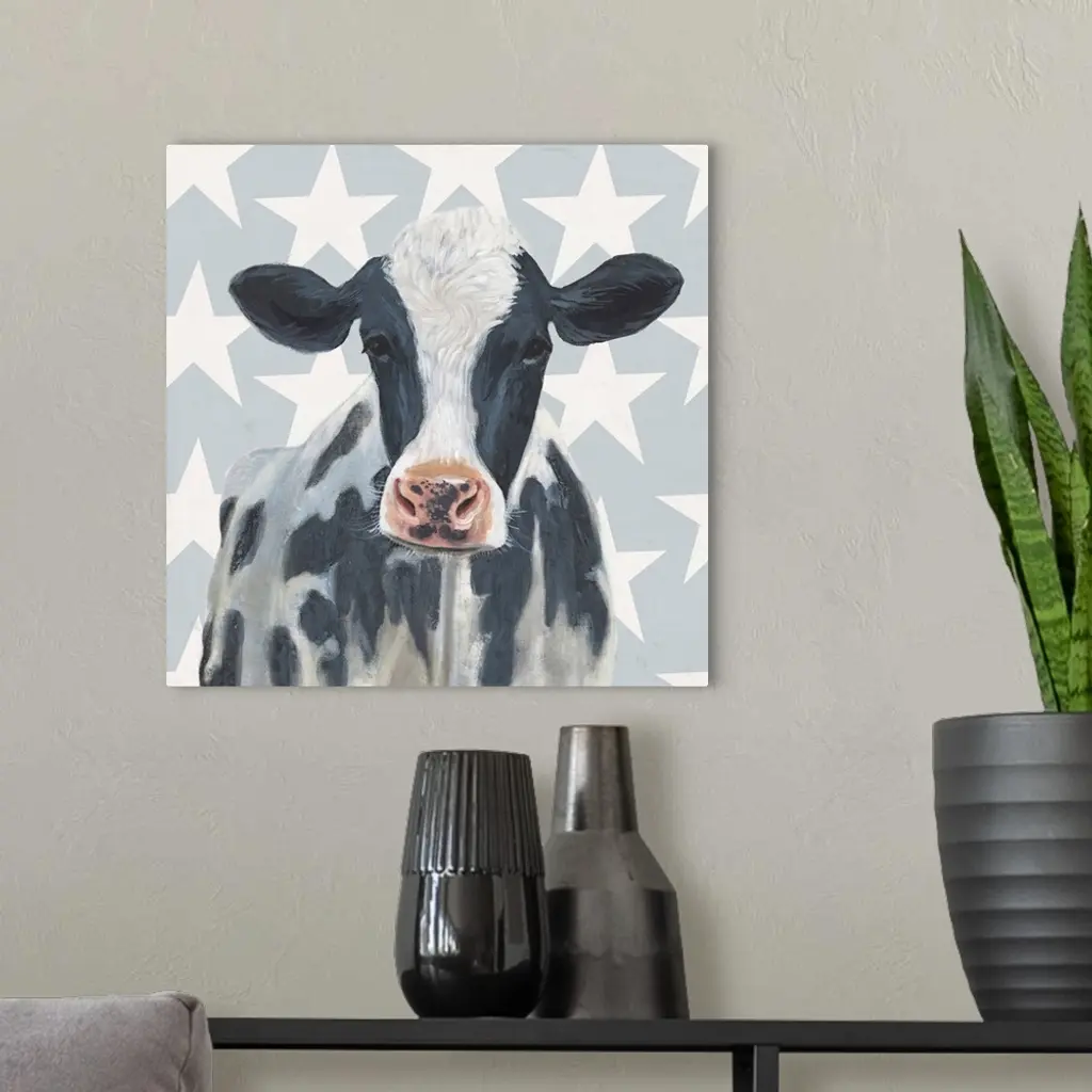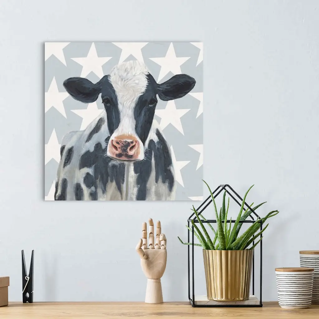Square painting of a black and white spotted cow on a gray and white star patterned background.