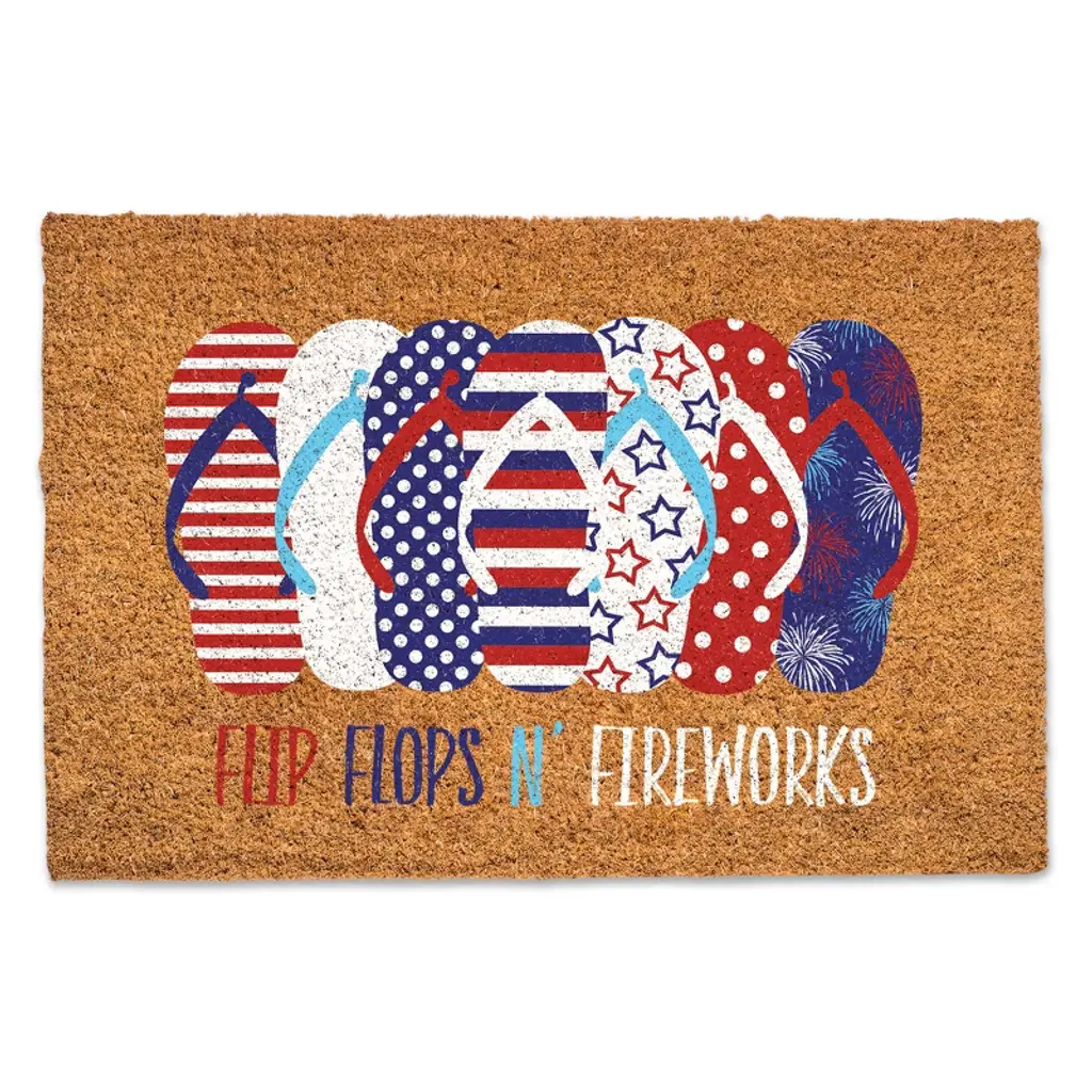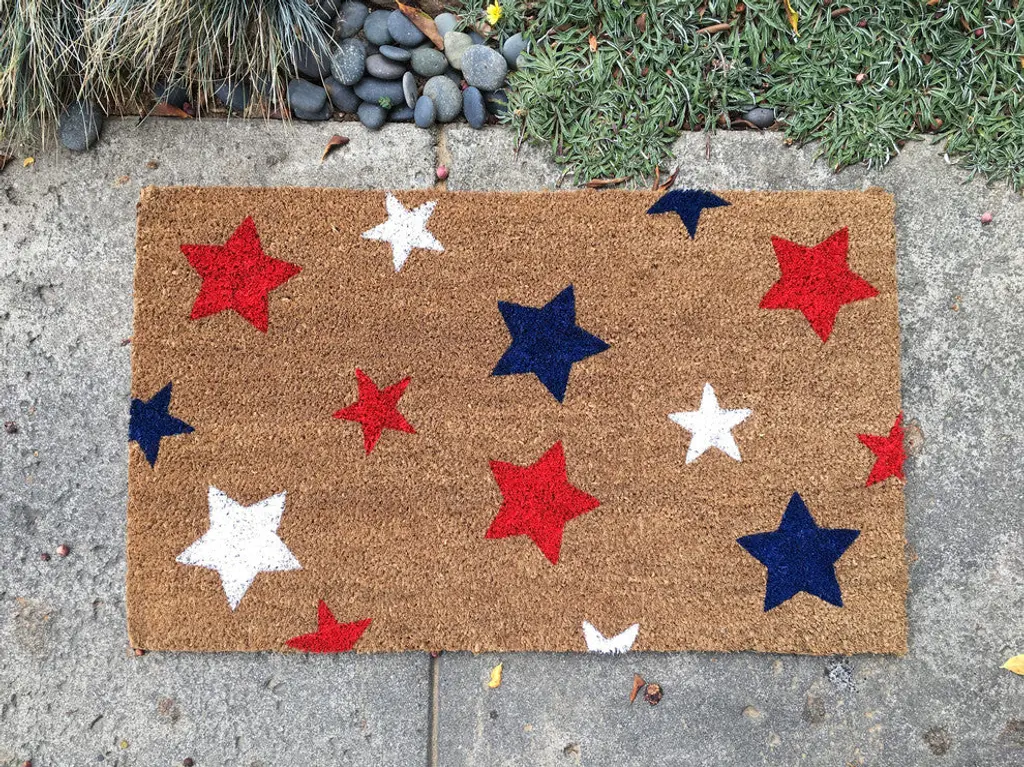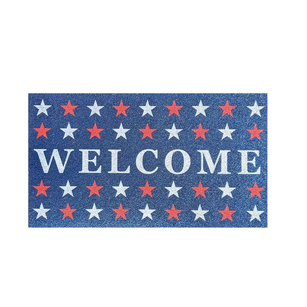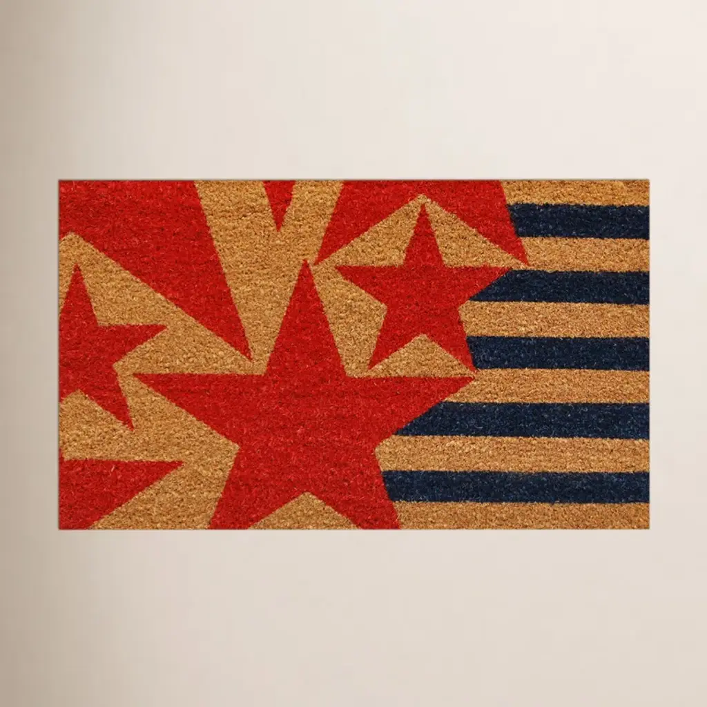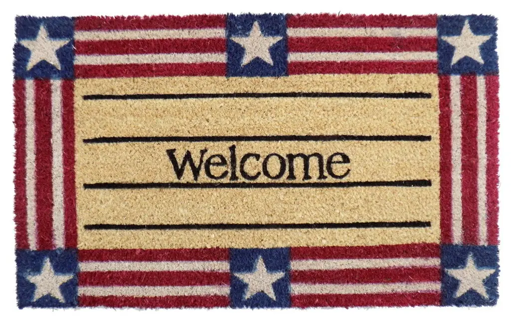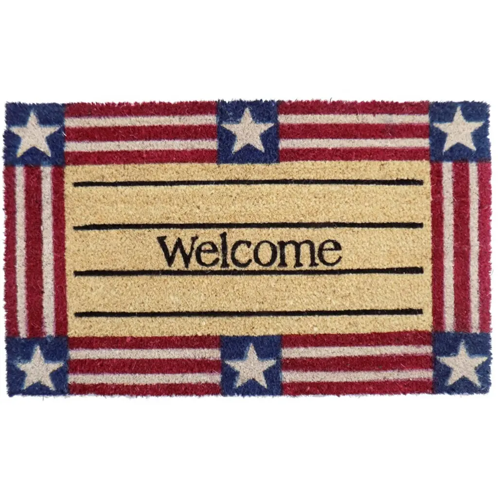 Your heart will beat true for this red and blue patriotic welcome mat. Woven from 100% natural coconut fiber, the mat is eco-friendly and perfect for both indoor and outdoor use. We use fade resistant, colorfast dye to keep the mat's artwork looking fresh year after year. The thick fibers absorb moisture, making them extremely durable and weather resistant. The coir provides an anti-skid surface that is also great for trapping dust and dirt. Each mat features a recycled rubber backing to keep it in place.