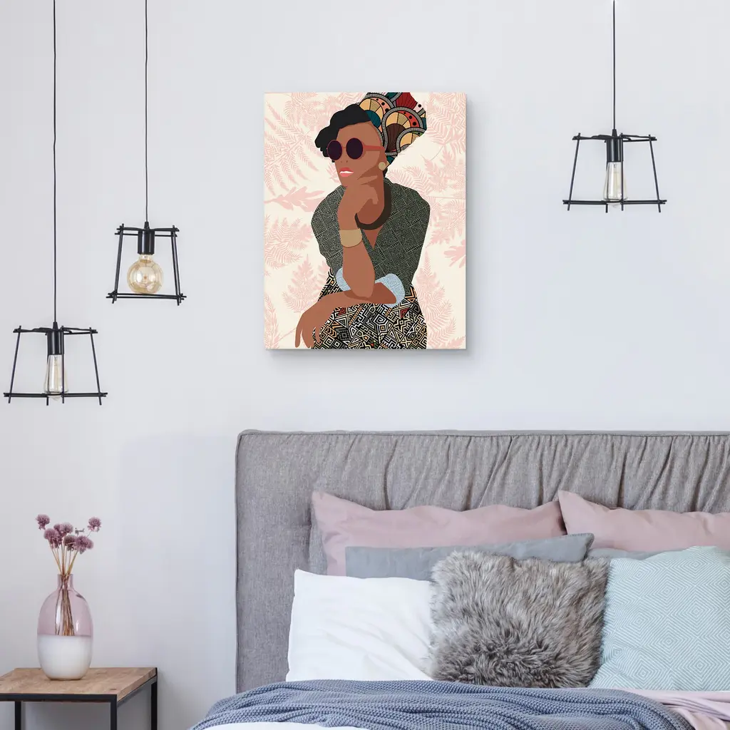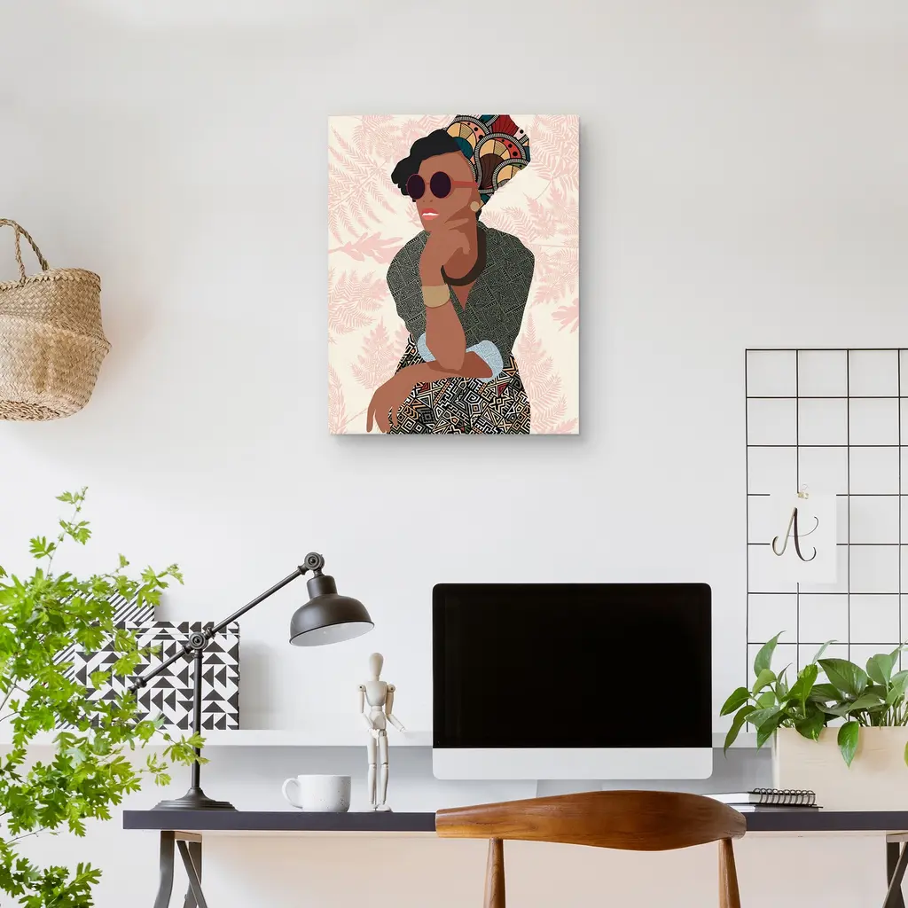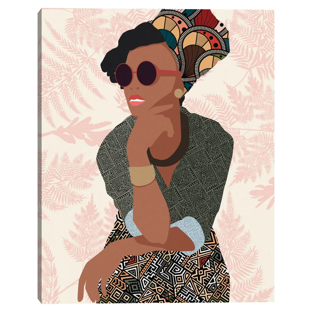Sometimes all it takes is a little self-confidence to pull off wearing an ensemble of contrasting patterns. Clothed in a variation of tribal prints, a lady offset by a tropical pink background embraces her dynamic style with grace. Pattern Panache II by Belle Maison is an appropriate title for a chic canvas art print.