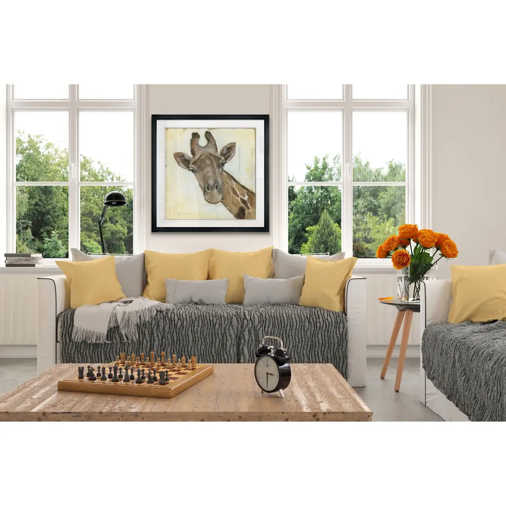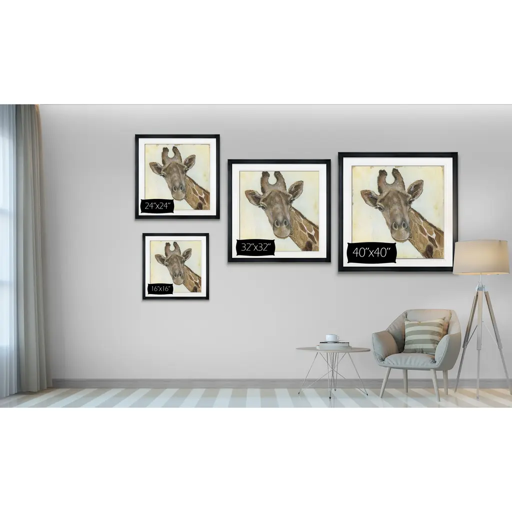 Patterned Giraffe -Framed Giclee Print A premium framed giclee print Printed using the last archival inks. Each print is carefully printed and framed by hand. Each piece features a 2'' Beveled matt board, acrylic glass and comes ready to hand. 4 SIZES AVILABLE 16''x16''- Overall Size 24''x22''- Overall Size 28''x28''' - Overall Size 32''x32''' - Overall Size 38''x38'' - Overall Size ** Overall size may vary slightly from piece to piece Each piece is made to order. Built to Last Each piece comes ready to hang Archival Ink 2'' Matt Board Assembled by hand in the America