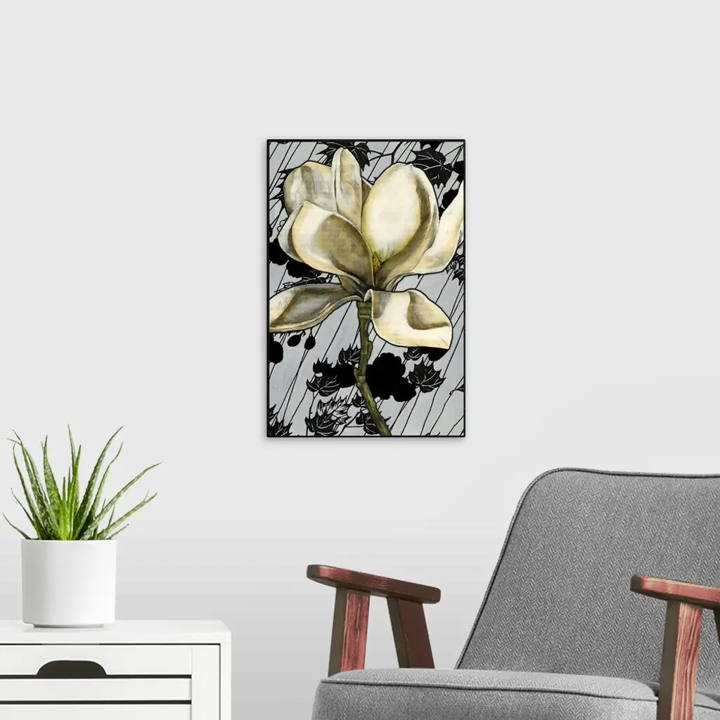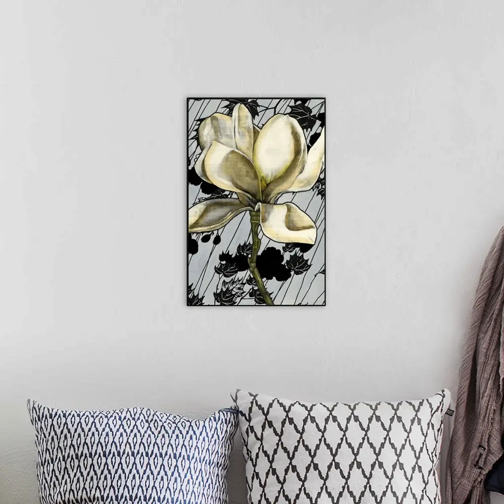 Contemporary artwork of a vintage stylized magnolia flower reminiscent of art nouveau.