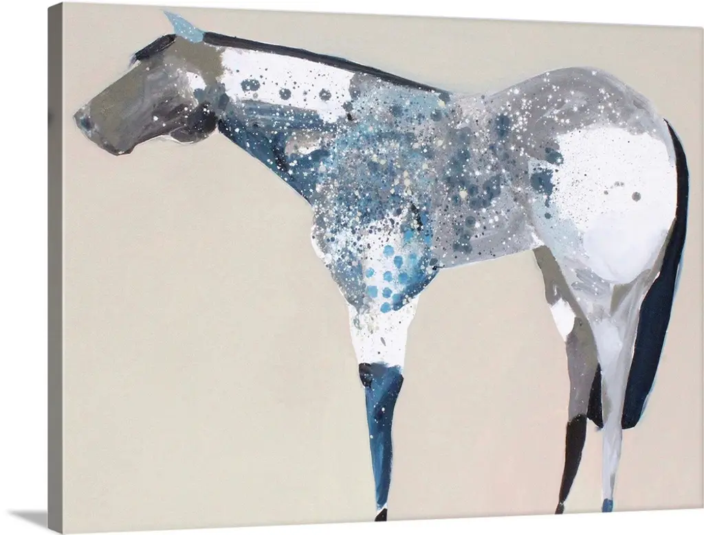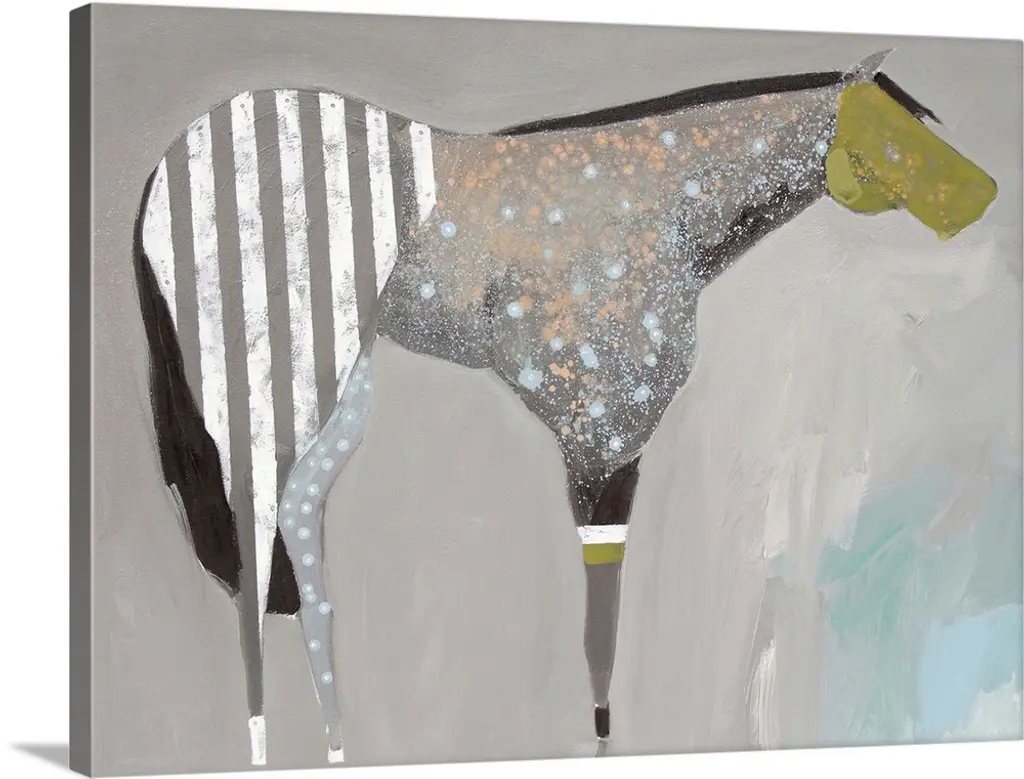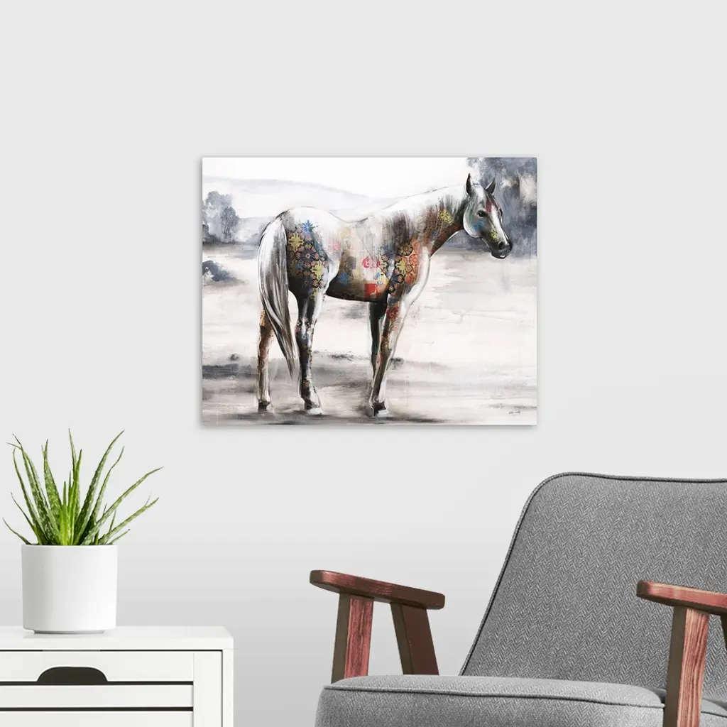 Contemporary artwork of a horse in a field created with colorful patterns made with mixed media.