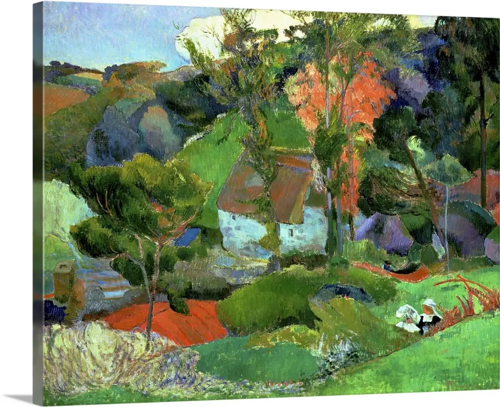 20" x 25" Paul Gauguin A Landscape- Farmhouse in Arles gallery wrapped premium canvas print reproduced to meet museum quality standards. Our museum quality canvas prints are produced using high-precision print technology for a more accurate reproduction printed on high quality canvas with fade-resistant, archival inks. Our progressive business model allows us to offer works of art to you at the best wholesale pricing, significantly less than art gallery prices, affordable to all. This artwork is gallery wrapped by one of our expert framers, wrapped with 1.5" deep heavy duty wooden stretcher bars, to hang frameless for a high-end designer look. Our gallery wrapped canvas print comes with hardware, ready to hang on your wall. We present a comprehensive collection of exceptional canvas art reproductions by Paul Gauguin .