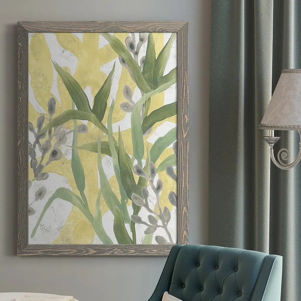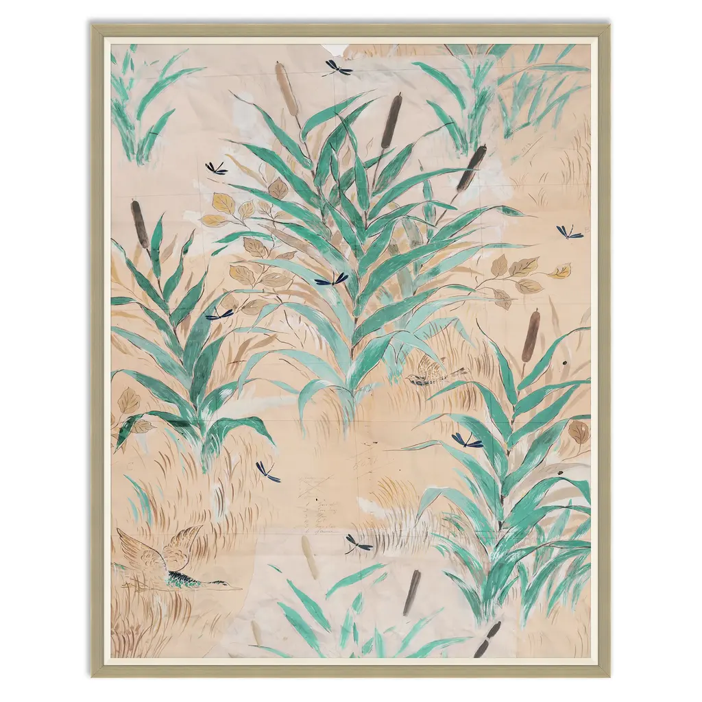 The Paule Marrot 'Les Roseaux' art from was sourced from the beautiful textile archives of French engraver, painter, and textile artist Paule Marrot. Her bold use of flowers, color and patterns reflect a compositionally modernist style classically associated with the Art Deco movement. Each work of art is hand-curated and framed in a variety of choices to suit your needs. Framing options include an acrylic box frame or a wood frame in gold, white, or silver. Also available unframed. Printed on museum quality paper. Overall Dimensions Delivery Shipping