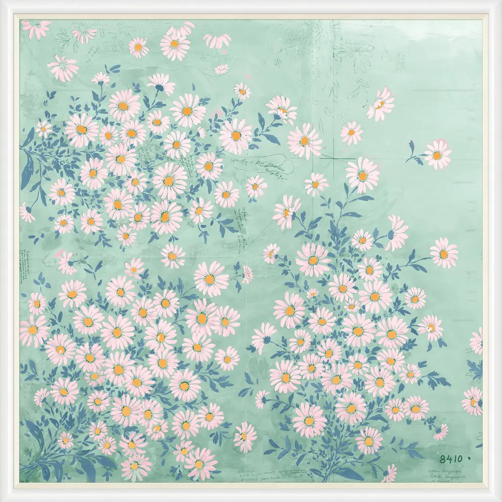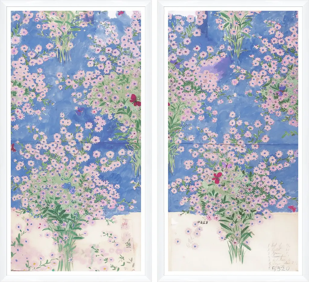 The 'Papillons Et Margeurites' art from was sourced from the beautiful textile archives of French engraver, painter, and artist Paule Marrot. Her bold use of flowers, color and patterns reflect a compositionally modernist style classically associated with the Art Deco movement.