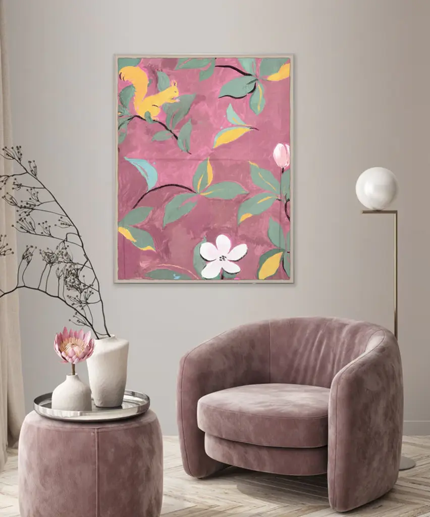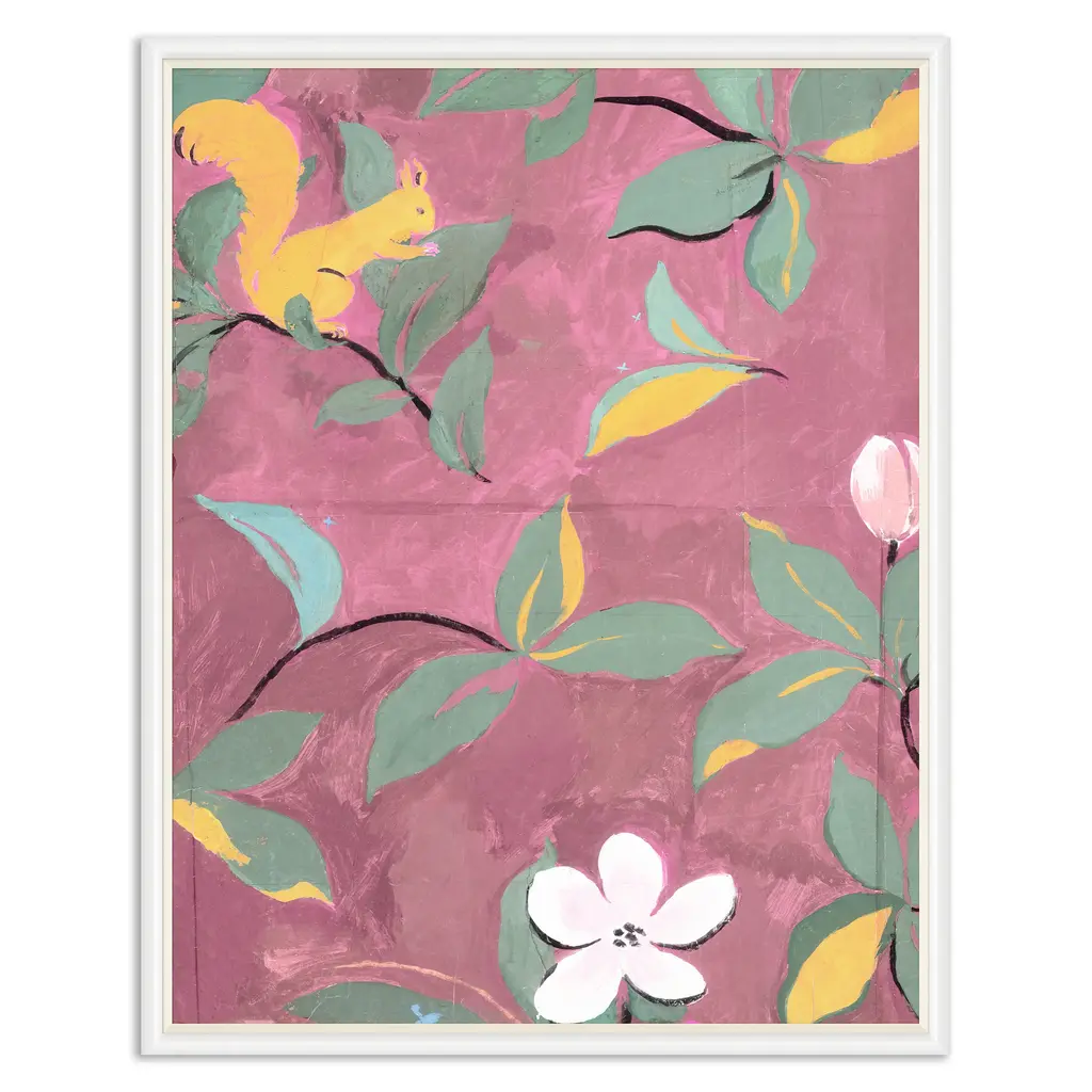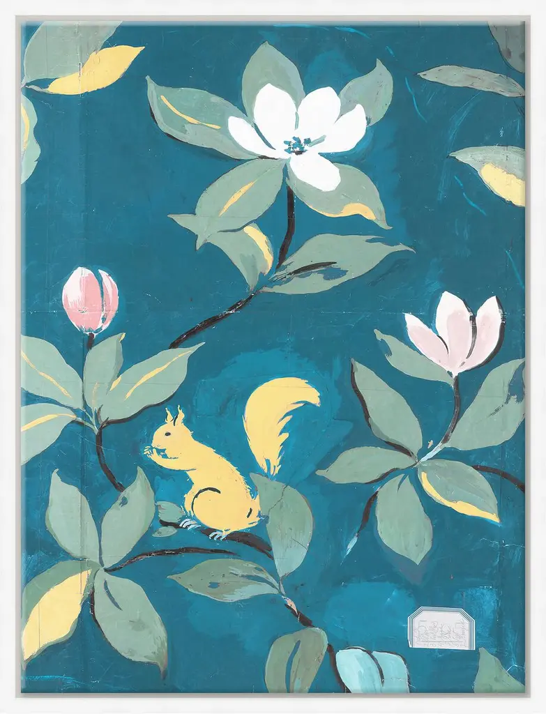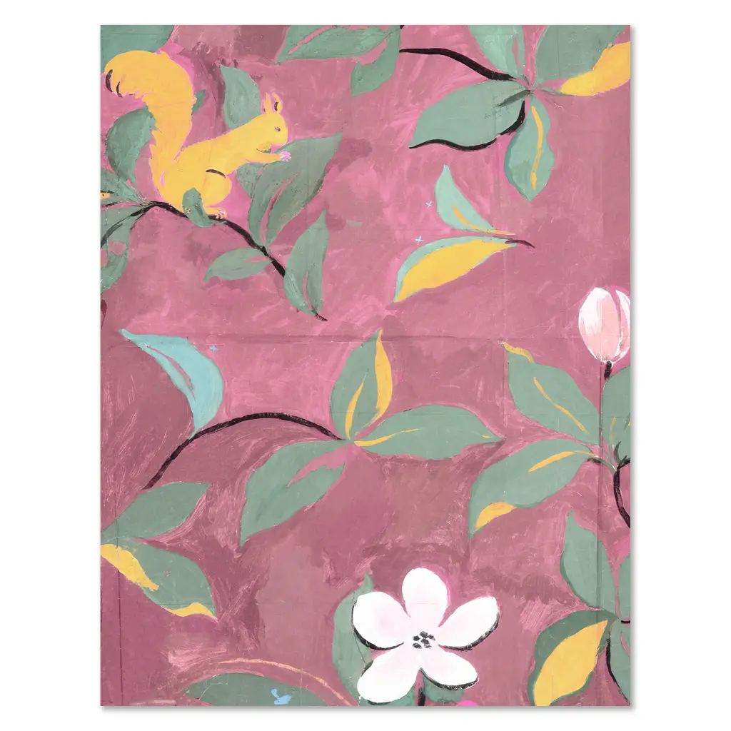 The Paule Marrot 'Squirrels' art was sourced by Soicher Marin from the beautiful textile archives of French engraver, painter, and textile artist Paule Marrot. Her bold use of flowers, color and patterns reflect a compositionally modernist style classically associated with the Art Deco movement.