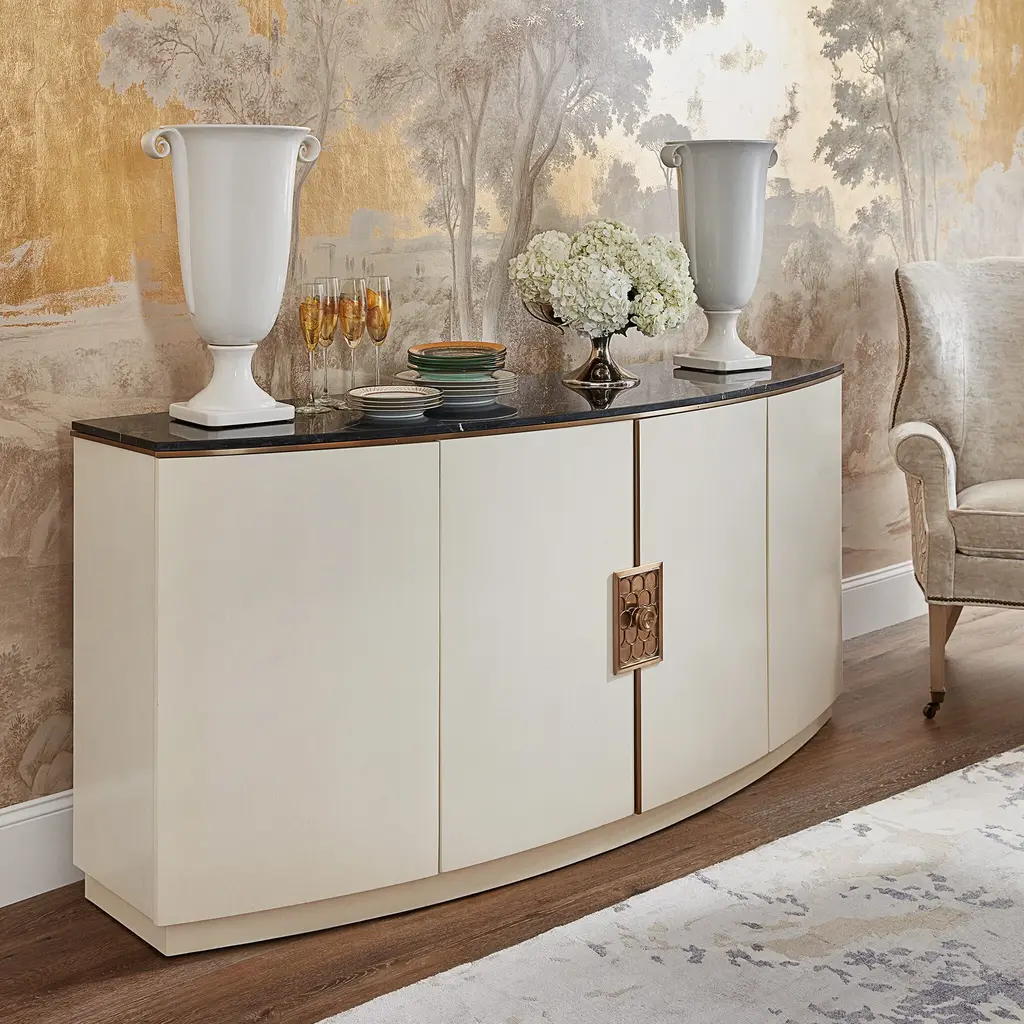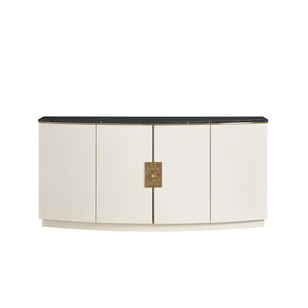 An elegant spin on a contemporary shape, the Paulina Server features a beautiful Ivory Faux Vellum finish and Black Nero Marquina top. Paired with the intricate brass hardware and accents, this statement piece makes a wonderful addition to hallways, living spaces, and dining rooms alike. Arrange fresh florals atop it to add extra warmth, or an assortment of abstract art pieces and sculptures to elevate it's contemporary style. It's four doors contain six shelves and a hidden drawer. Ships In 4-5 Weeks Brass hardware and accents Black Nero Marguina Marble top Ivory Faux Vellum Rounded front This image is for illustrative purposes only. The colors shown are accurate within the constraints of lighting, photography, and the color accuracy of your screen.