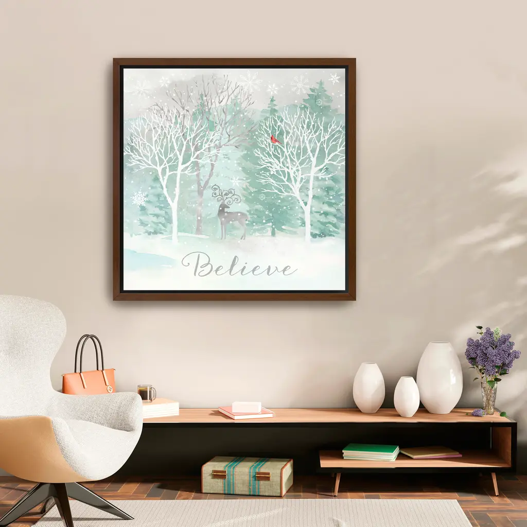 Celebrate the quiet beauty of winter with this serene canvas print featuring a graceful deer and falling snowflakes. The soft pastel tones and elegant "Believe" script create a peaceful focal point for seasonal decorating. Our Gallery Wrap Canvas Prints are proudly assembled with high quality materials in California, USA. Each piece is printed on a thick, archival grade canvas using Giclee technology. It is then hand-stretched by our experienced artisans over solid wood bars, which will not warp over time. The final product is a piece personally crafted for you to confidently display on your wall. Care and Assembly: Ensure that the location of your piece has little to no exposure to heat, sunlight, and moisture. Wipe clean, only if needed. Each piece includes hanging hardware to hang on your wall horizontally.