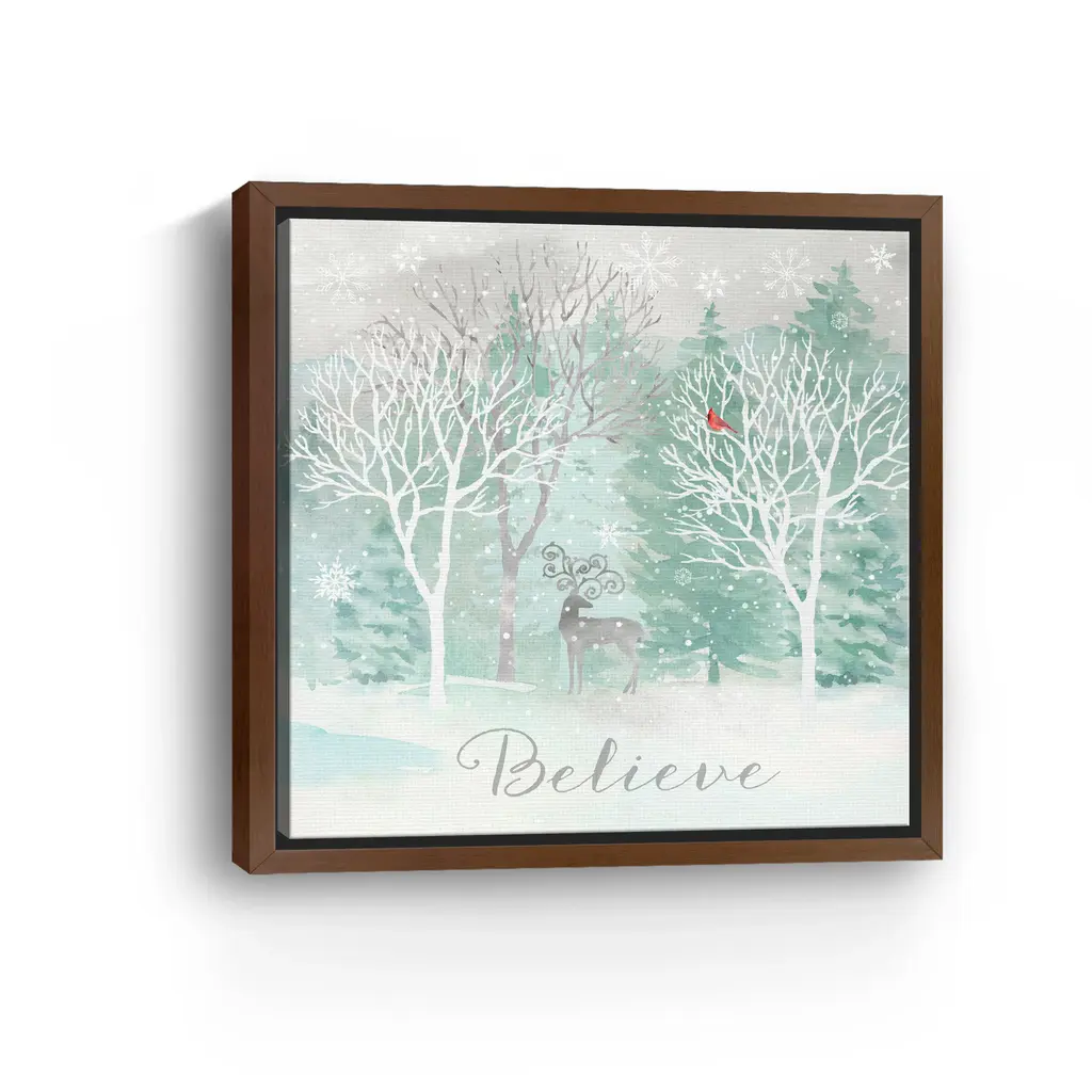 Celebrate the quiet beauty of winter with this serene canvas print featuring a graceful deer and falling snowflakes. The soft pastel tones and elegant "Believe" script create a peaceful focal point for seasonal decorating. Our Gallery Wrap Canvas Prints are proudly assembled with high quality materials in California, USA. Each piece is printed on a thick, archival grade canvas using Giclee technology. It is then hand-stretched by our experienced artisans over solid wood bars, which will not warp over time. The final product is a piece personally crafted for you to confidently display on your wall. Care and Assembly: Ensure that the location of your piece has little to no exposure to heat, sunlight, and moisture. Wipe clean, only if needed. Each piece includes hanging hardware to hang on your wall horizontally.
