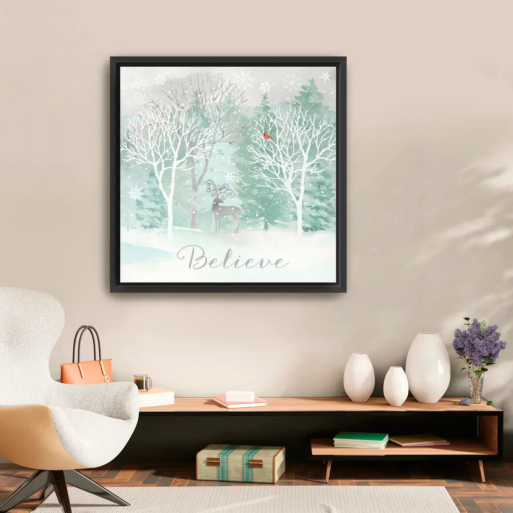 Celebrate the quiet beauty of winter with this serene canvas print featuring a graceful deer and falling snowflakes. The soft pastel tones and elegant "Believe" script create a peaceful focal point for seasonal decorating. Our Gallery Wrap Canvas Prints are proudly assembled with high quality materials in California, USA. Each piece is printed on a thick, archival grade canvas using Giclee technology. It is then hand-stretched by our experienced artisans over solid wood bars, which will not warp over time. The final product is a piece personally crafted for you to confidently display on your wall. Care and Assembly: Ensure that the location of your piece has little to no exposure to heat, sunlight, and moisture. Wipe clean, only if needed. Each piece includes hanging hardware to hang on your wall horizontally.