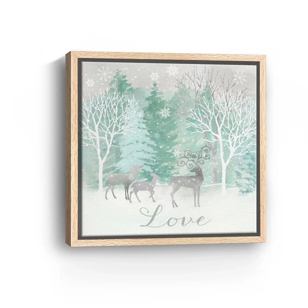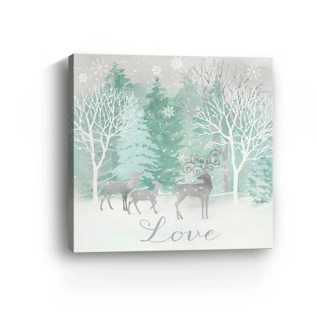 Add a touch of woodland wonder to your home with this winter-themed canvas artwork showcasing a deer among snow-covered trees. The soft pastel tones and elegant "Love" script create a peaceful focal point for seasonal decorating. Our Gallery Wrap Canvas Prints are proudly assembled with high quality materials in California, USA. Each piece is printed on a thick, archival grade canvas using Giclee technology. It is then hand-stretched by our experienced artisans over solid wood bars, which will not warp over time. The final product is a piece personally crafted for you to confidently display on your wall. Care and Assembly: Ensure that the location of your piece has little to no exposure to heat, sunlight, and moisture. Wipe clean, only if needed. Each piece includes hanging hardware to hang on your wall horizontally.