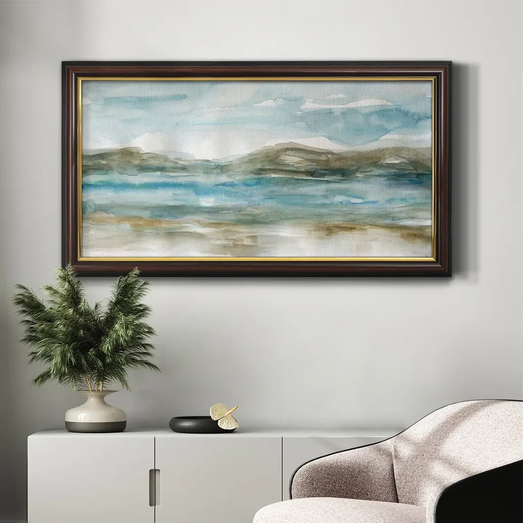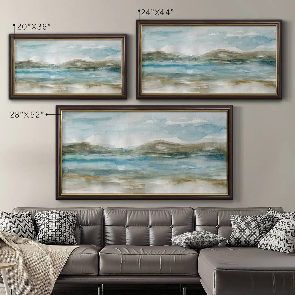 Peaceful Beach I Premium Framed Canvas- Ready to Hang A Premium Framed Canvas created to last. Framed in distressed wood and available in an array of sizes and colors Featuring a beveled a solid wood stretcher bar, each piece comes ready to hand 3 SIZES AVAILABLE 21''X37'' - Overall Size 25''X45'' - Overall Size 29''x53'' - Overall Size Each piece is made to order. Each piece comes with hanging hardware. Made in the USA Ready to Hang Giclee Paper Print Acrylic Glass Beveled Matt Board