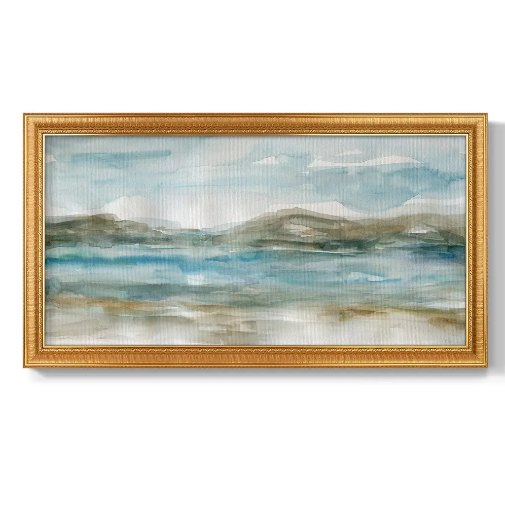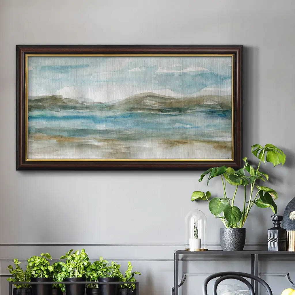 Peaceful Beach I Premium Framed Canvas- Ready to Hang A Premium Framed Canvas created to last. Framed in distressed wood and available in an array of sizes and colors Featuring a beveled a solid wood stretcher bar, each piece comes ready to hand 3 SIZES AVAILABLE 21''X37'' - Overall Size 25''X45'' - Overall Size 29''x53'' - Overall Size Each piece is made to order. Each piece comes with hanging hardware. Made in the USA Ready to Hang Giclee Paper Print Acrylic Glass Beveled Matt Board