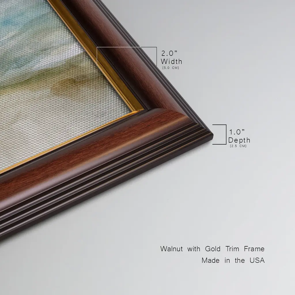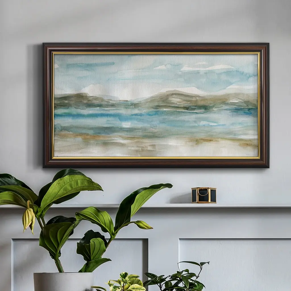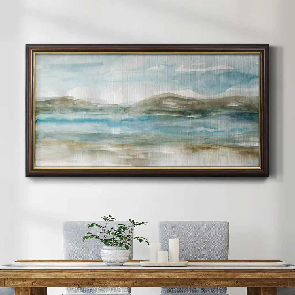 Peaceful Beach I Premium Framed Canvas- Ready to Hang A Premium Framed Canvas created to last. Framed in distressed wood and available in an array of sizes and colors Featuring a beveled a solid wood stretcher bar, each piece comes ready to hand 3 SIZES AVAILABLE 21''X37'' - Overall Size 25''X45'' - Overall Size 29''x53'' - Overall Size Each piece is made to order. Each piece comes with hanging hardware. Made in the USA Ready to Hang Giclee Paper Print Acrylic Glass Beveled Matt Board