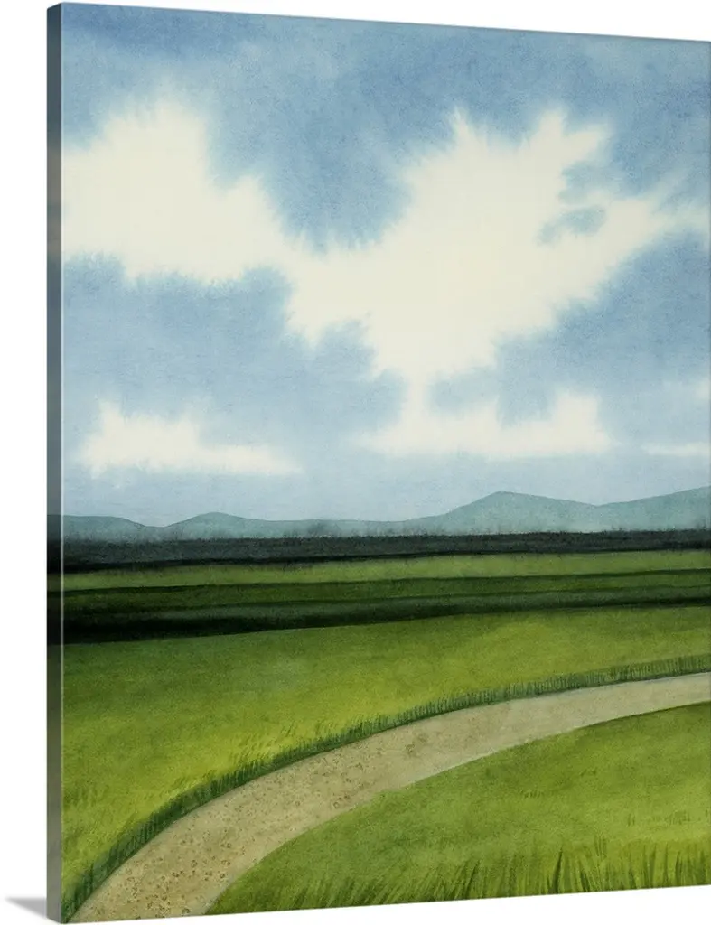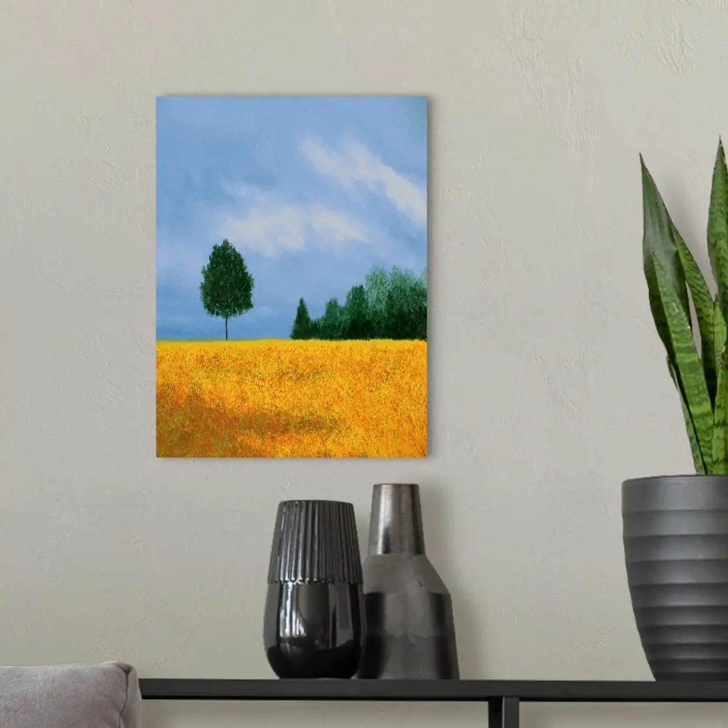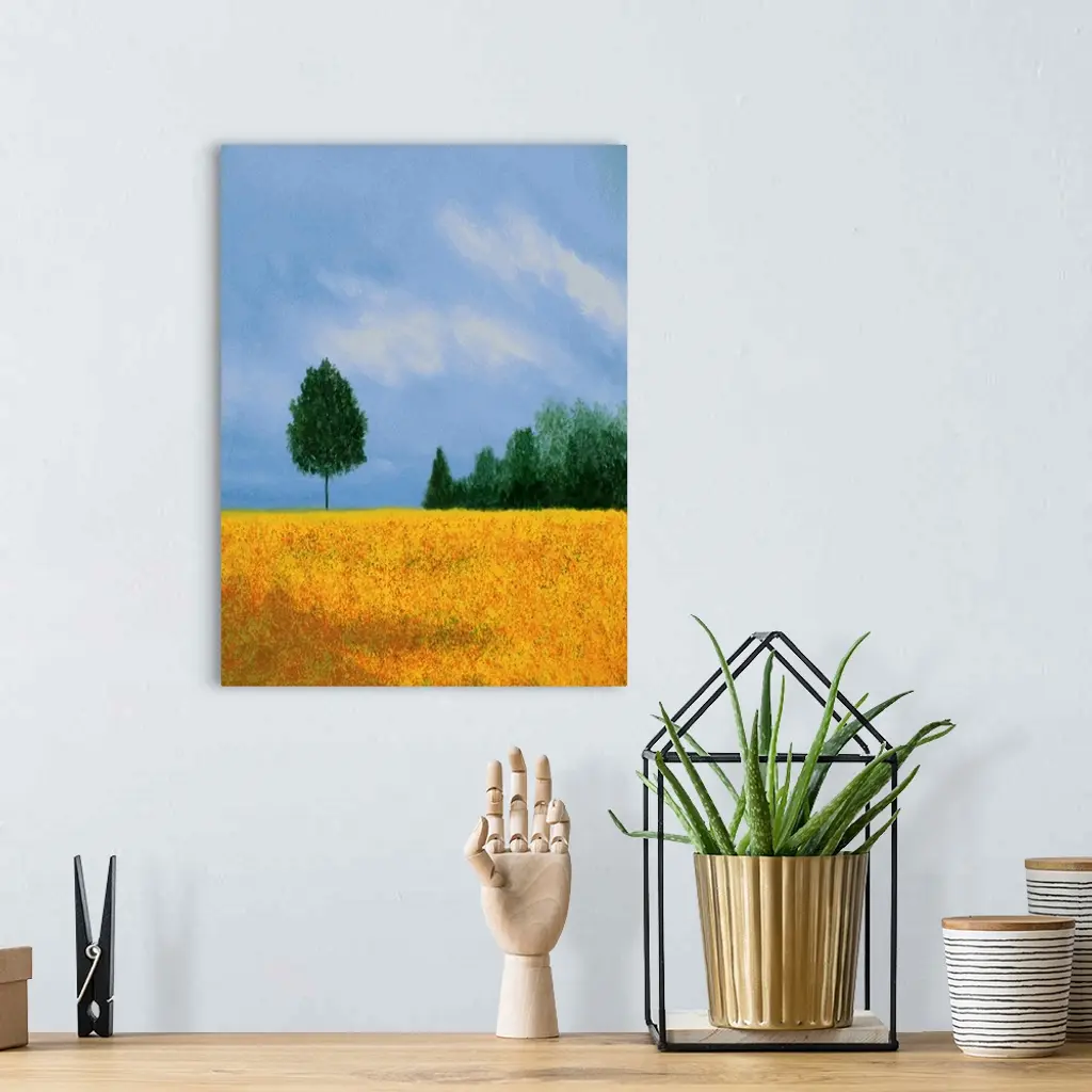 Vertical landscape painting with a golden field in the foreground and trees in the background.