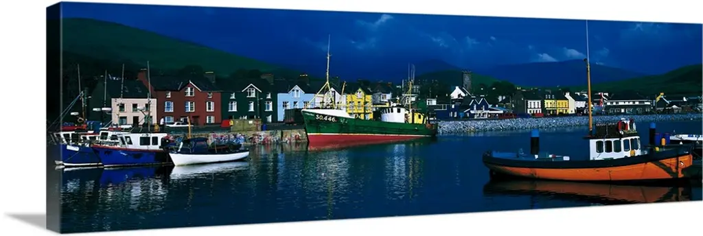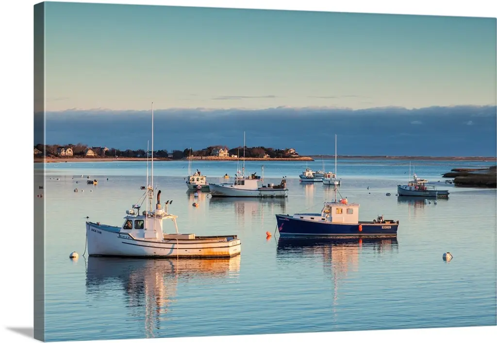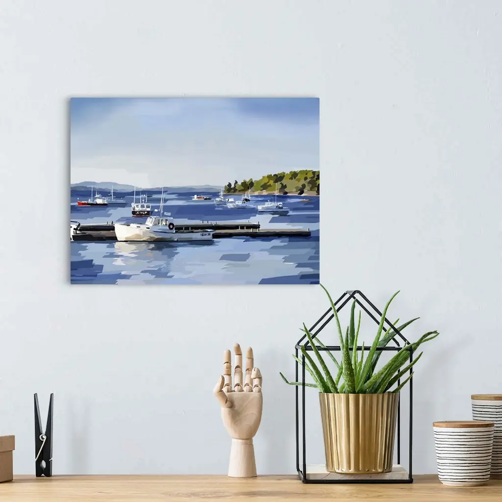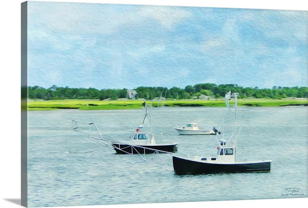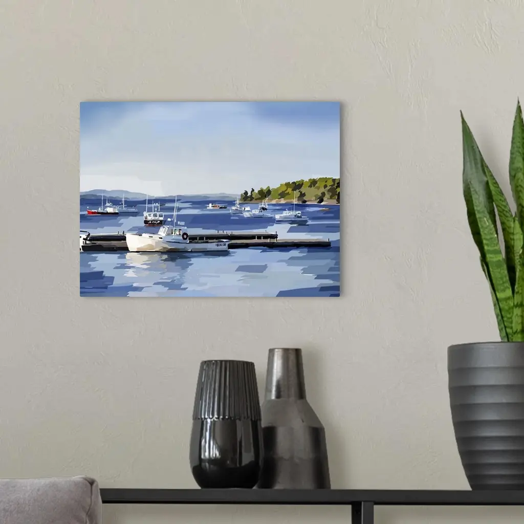 Serene seascape painting of fishing boats on the deep blue water in a bay.