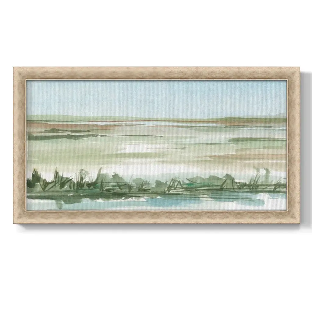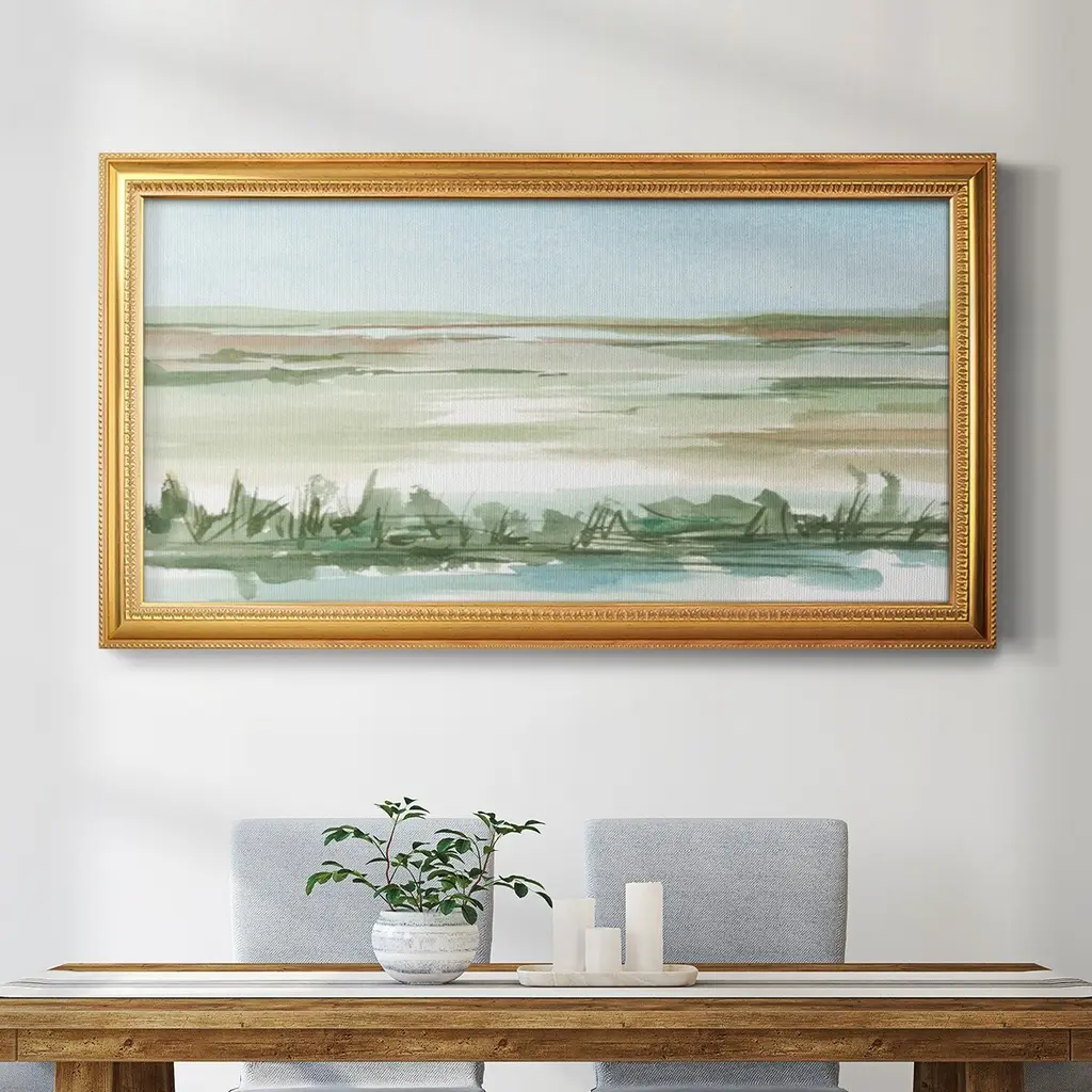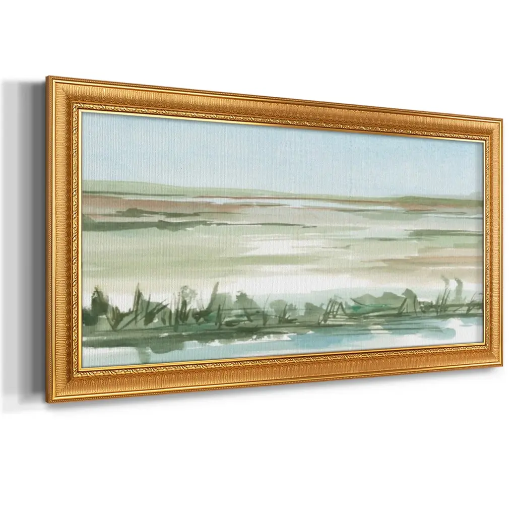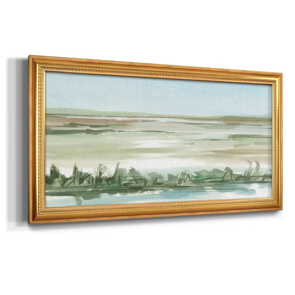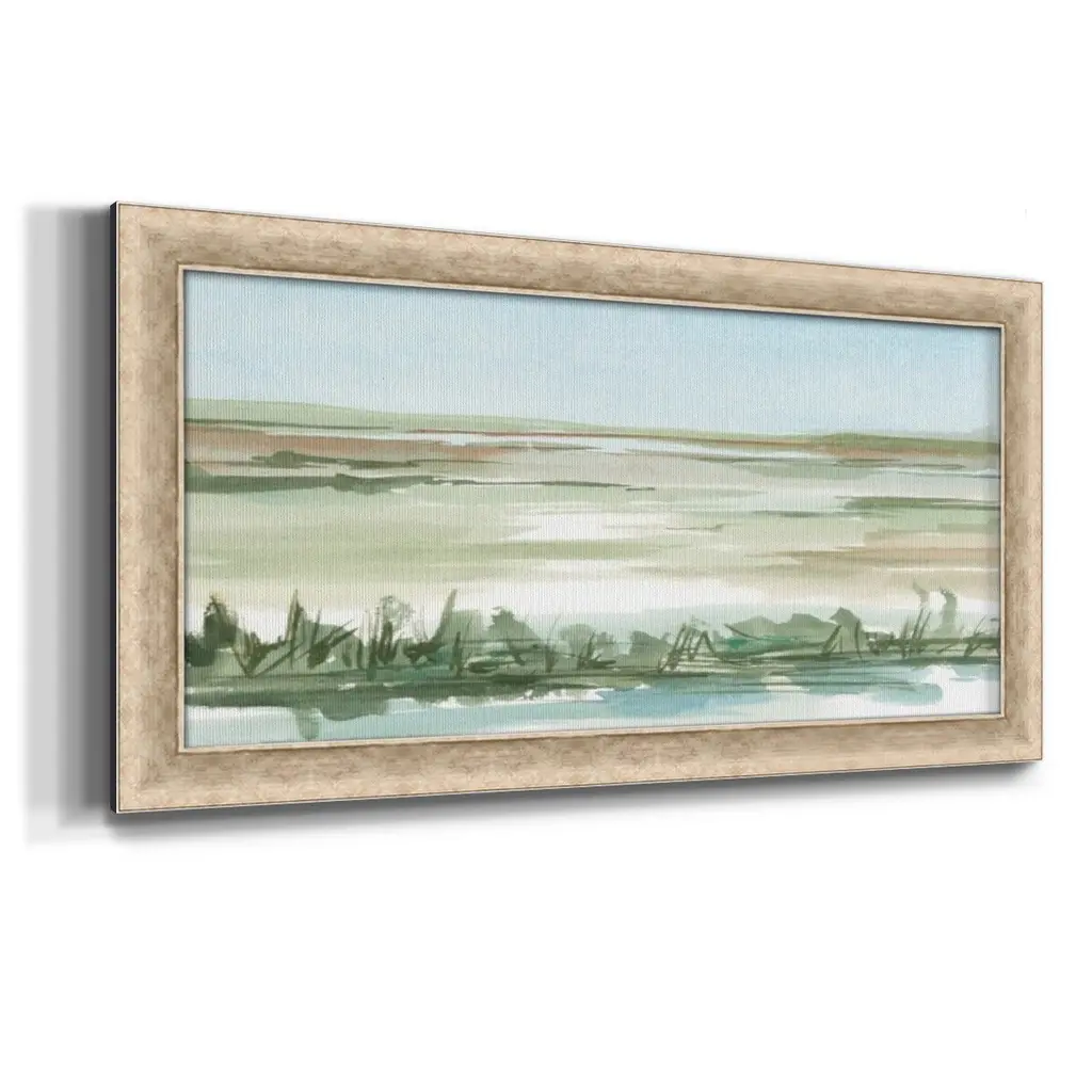Peaceful Lowland II Premium Framed Canvas- Ready to Hang A Premium Framed Canvas created to last. Framed in distressed wood and available in an array of sizes and colors Featuring a beveled a solid wood stretcher bar, each piece comes ready to hand 3 SIZES AVAILABLE 21''X37'' - Overall Size 25''X45'' - Overall Size 29''x53'' - Overall Size Each piece is made to order. Each piece comes with hanging hardware. Made in the USA Ready to Hang Giclee Paper Print Acrylic Glass Beveled Matt Board