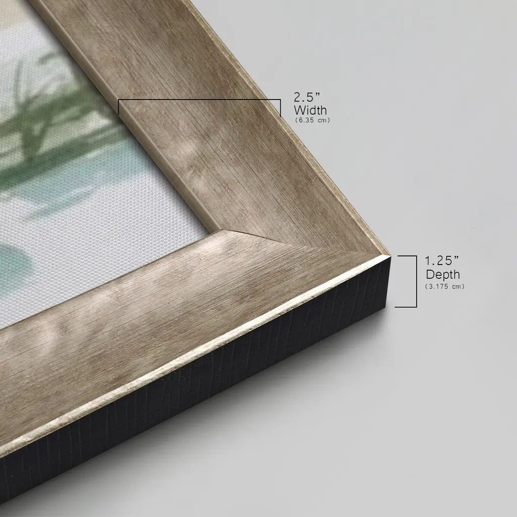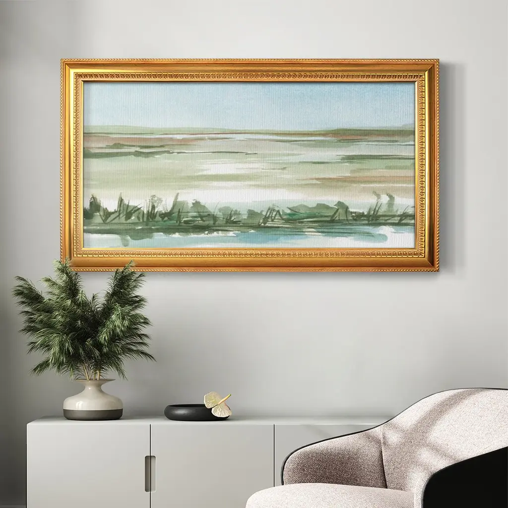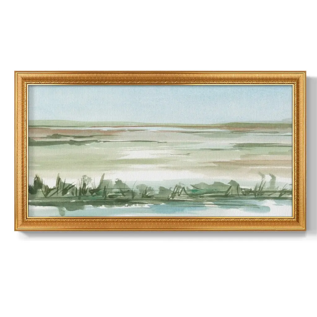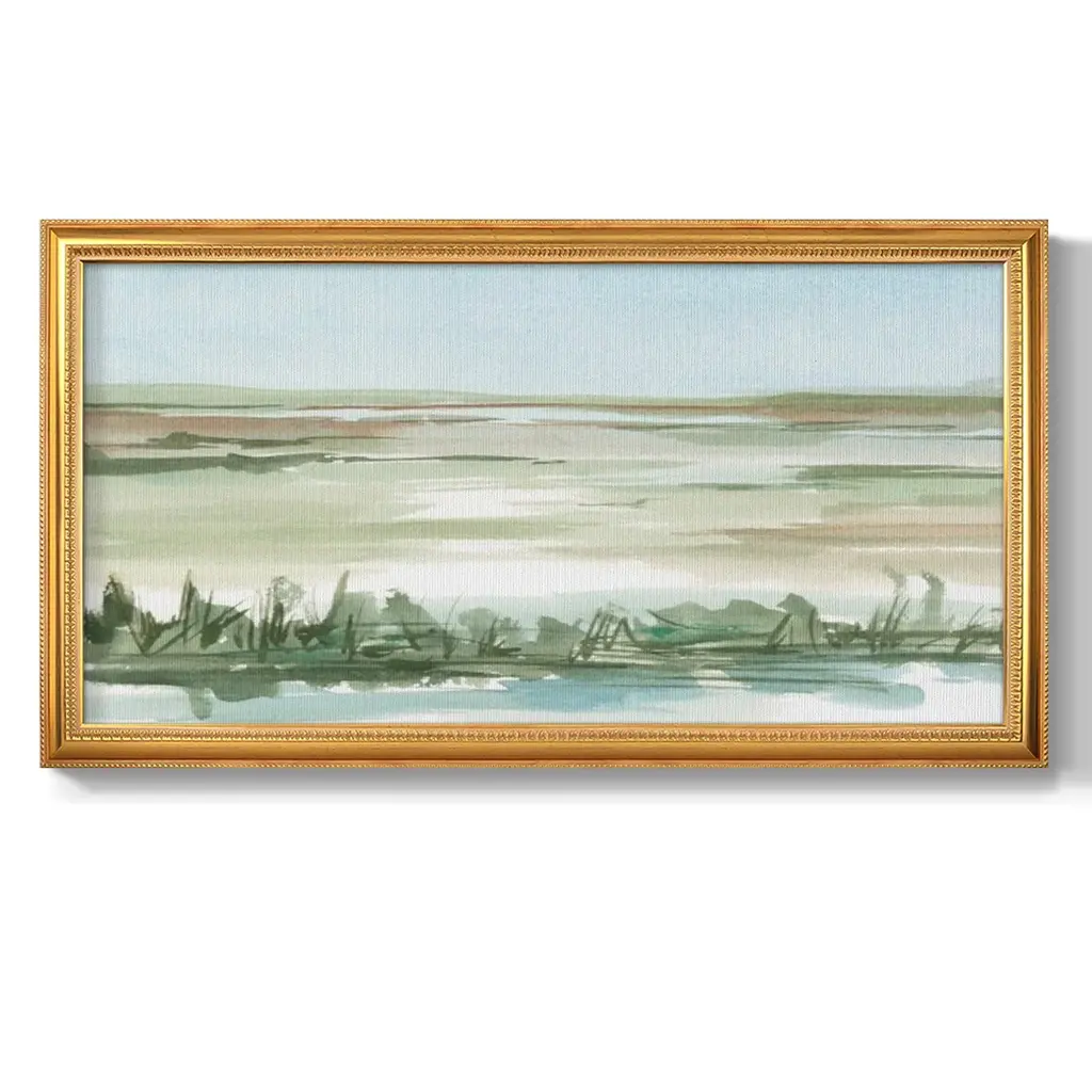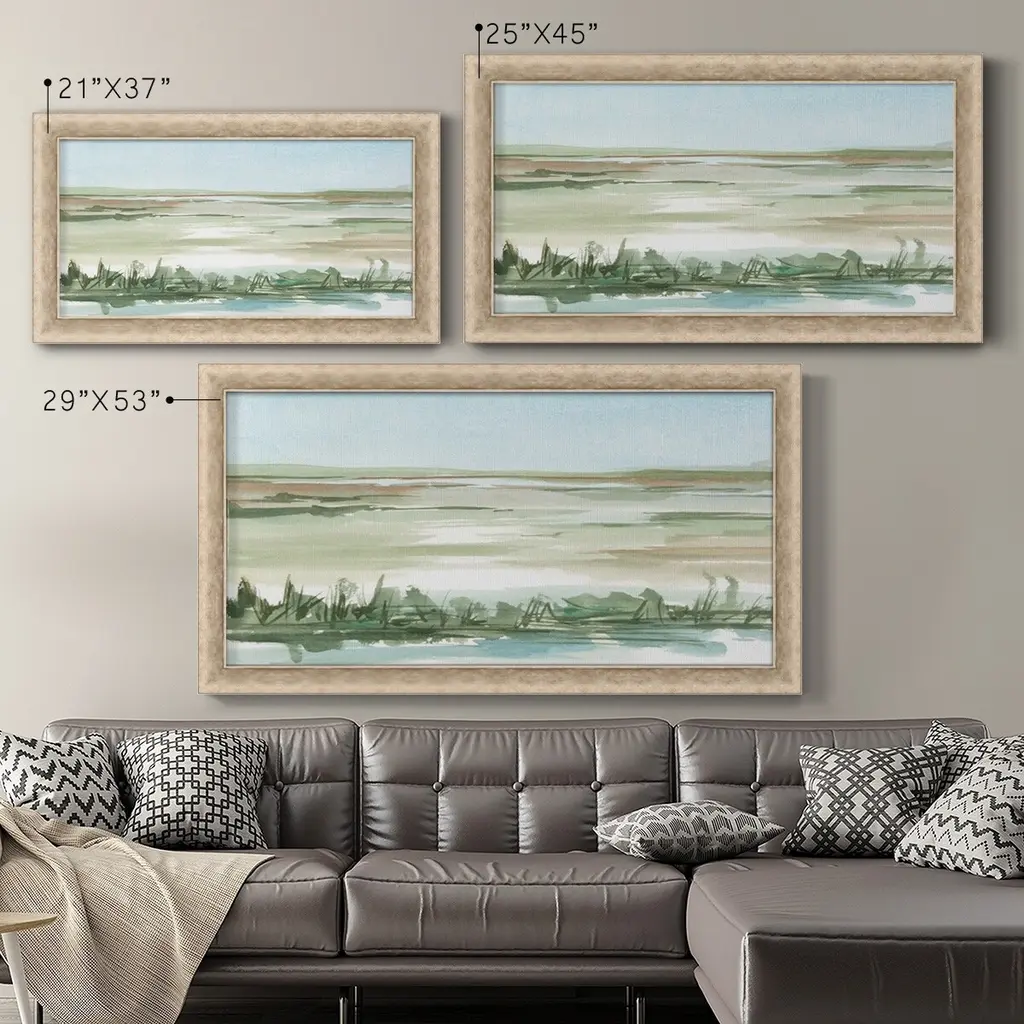 Peaceful Lowland II Premium Framed Canvas- Ready to Hang A Premium Framed Canvas created to last. Framed in distressed wood and available in an array of sizes and colors Featuring a beveled a solid wood stretcher bar, each piece comes ready to hand 3 SIZES AVAILABLE 21''X37'' - Overall Size 25''X45'' - Overall Size 29''x53'' - Overall Size Each piece is made to order. Each piece comes with hanging hardware. Made in the USA Ready to Hang Giclee Paper Print Acrylic Glass Beveled Matt Board