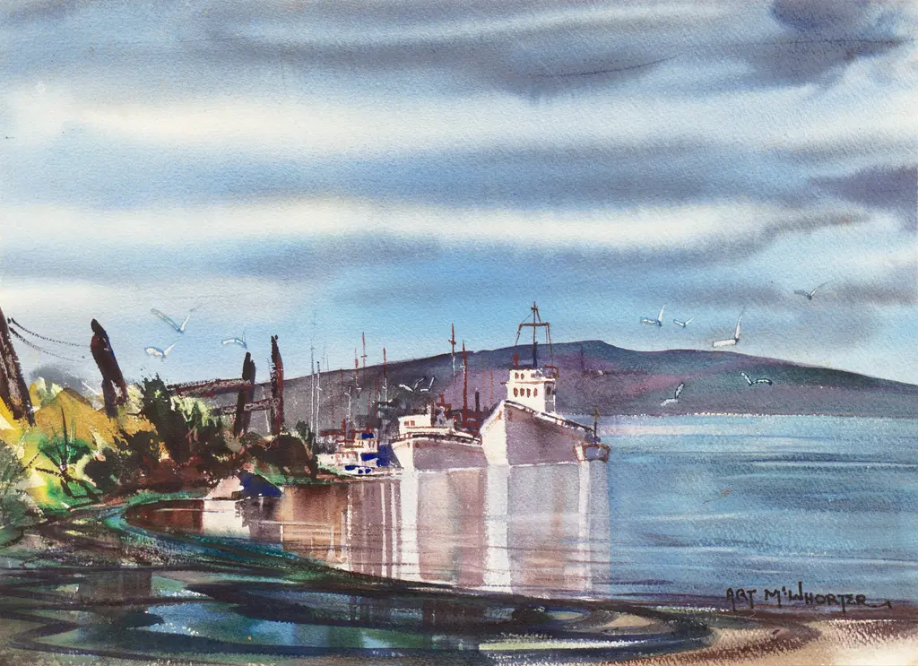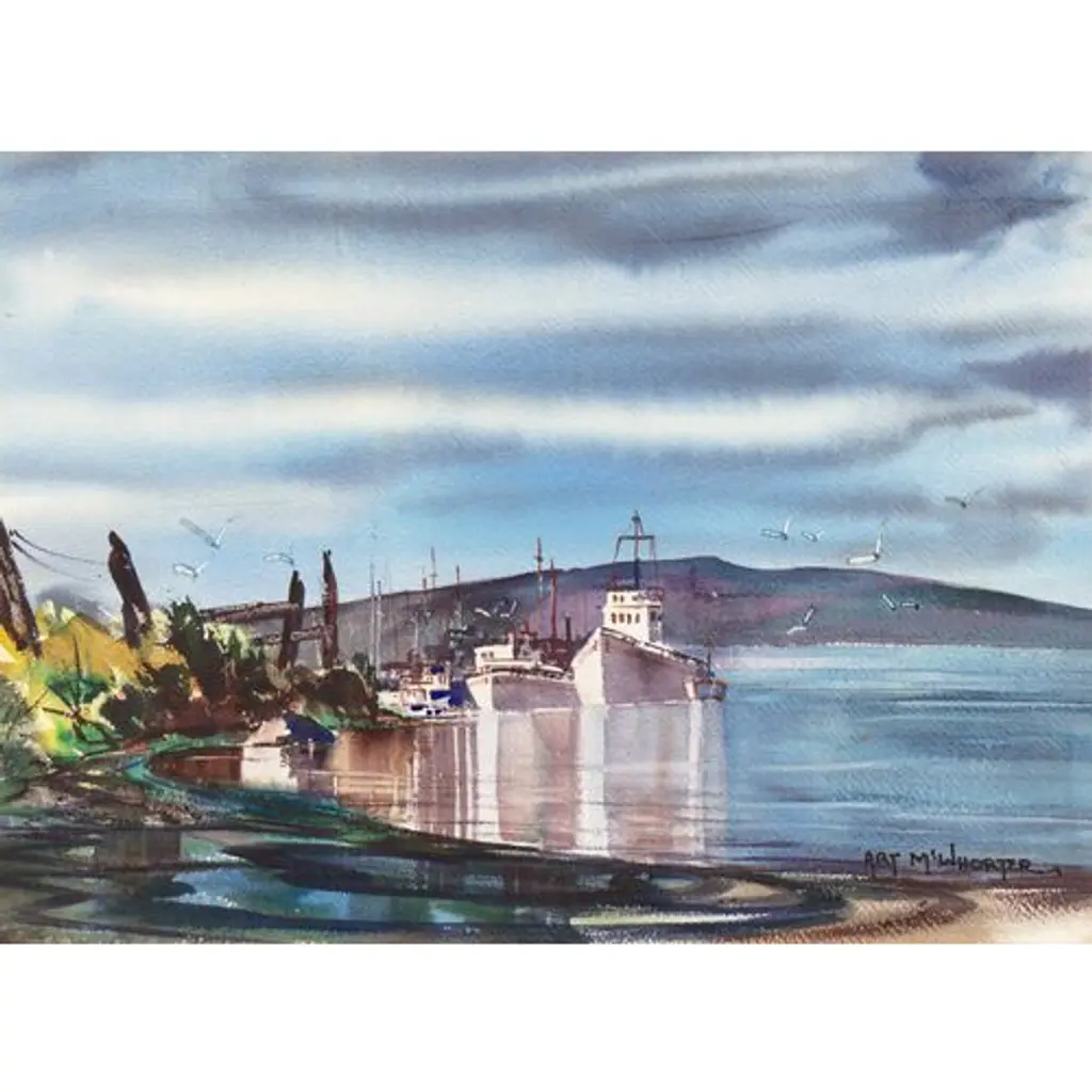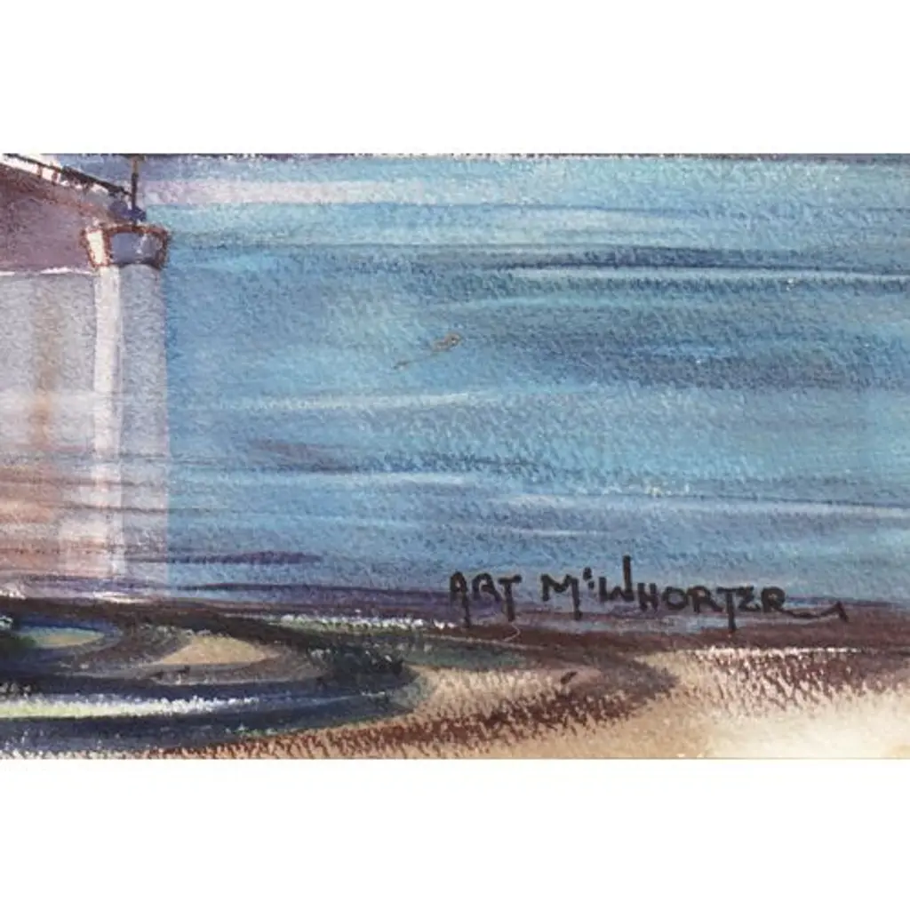 A finely-painted and period watercolor showing lights reflected in calm harbor waters beneath clouded, slate and blue skies and with a view beyond towards lavender-tinged hills. Signed "Art McWhorter" (American, 20th century). Art McWhorter studied at the American Artist's Professional League in New York. A member of the American Watercolor Society and the Society of Western Artists, he exhibited widely and with success and was the recipient of numerous medals, prizes and juried awards.