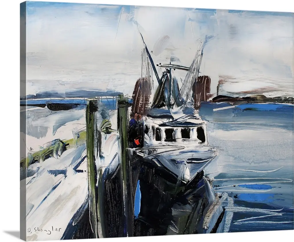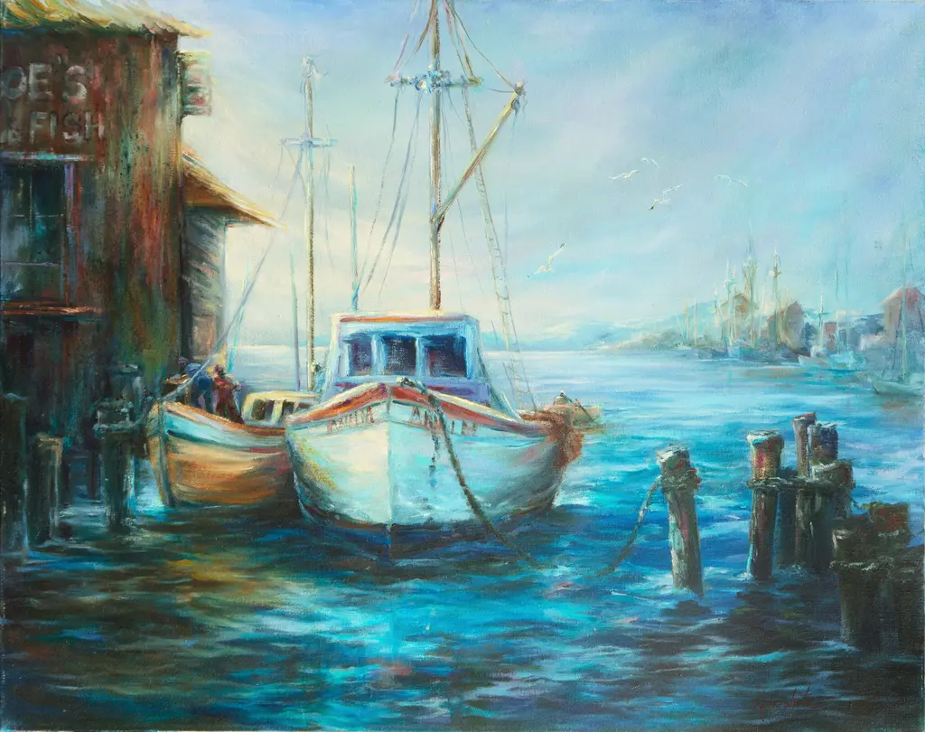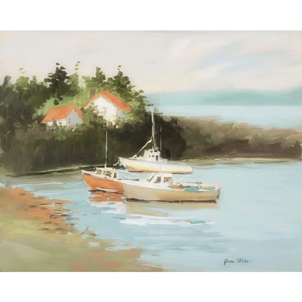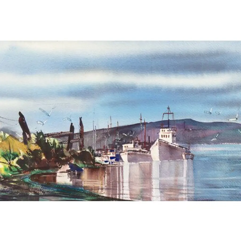 A finely-painted and period watercolor showing lights reflected in calm harbor waters beneath clouded, slate and blue skies and with a view beyond towards lavender-tinged hills. Signed "Art McWhorter" (American, 20th century). Art McWhorter studied at the American Artist's Professional League in New York. A member of the American Watercolor Society and the Society of Western Artists, he exhibited widely and with success and was the recipient of numerous medals, prizes and juried awards.